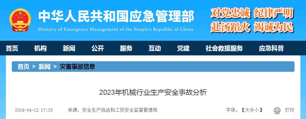 2024年4月12日,应急管理部发布了2023年机械行业生产安全事故分析。2023年,机械行业共发生生产安全事故310起、死亡294人(不含火灾、特种设备、建设工程事故),分析总结了2023年机械行业生产安全事故特点;指出了机械行业10个重大安全风险、9个较大安全风险、6个新风险;提出了5项措施建议。