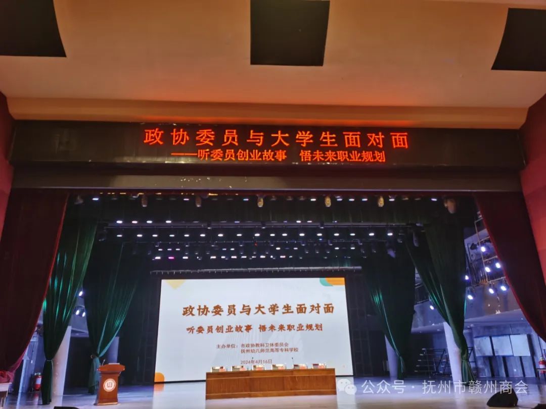 ★★★4月16日下午,由抚州市政协教科卫体委员会和抚州幼儿师范专科学校联合主办的“政协委员与大学生面对面”活动,在抚州幼儿师范高等专科学校牡丹亭大剧院(市政协中共党员委员工作站)举行。此活动主题为——听委员创业故事、悟未来职业规划。活动邀请到市非公经济组织党委副书记、市赣州商会党支部书记兼秘书长、江西地美丽建筑装饰材料有限公司董事长刘小东等五位市政协委员,向在座的大学生们,报告分享了各自的创业故事,并与大家现场沟通,回答大学生们提出的问题。