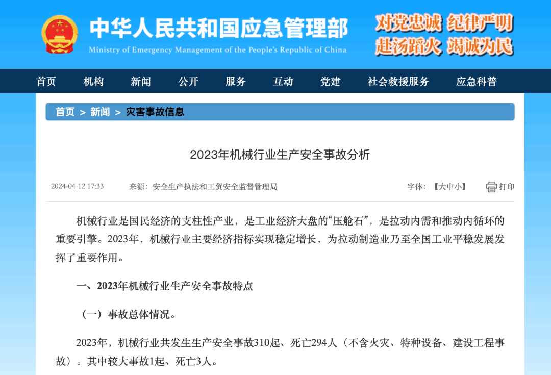 2023年,机械行业共发生生产安全事故310起、死亡294人(不含火灾、特种设备、建设工程事故)。其中较大事故1起、死亡3人。