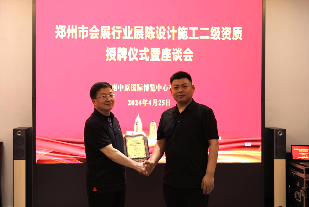 授牌仪式上,郑州会展行业协会副会长、搭建商专委会主任李文辉介绍了郑州会展行业展陈设计施工资质认证情况,通过资质认定对有效解决搭建商市场诸多问题,规范行业经营秩序将起到积极的作用,有利于加强行业相关市场主体紧密合作,推进郑州会展行业健康有序发展。李文辉副会长代表协会向梅讯奇总经理授予河南中原国际博览中心有限公司展陈设计施工二级资质等级证牌。