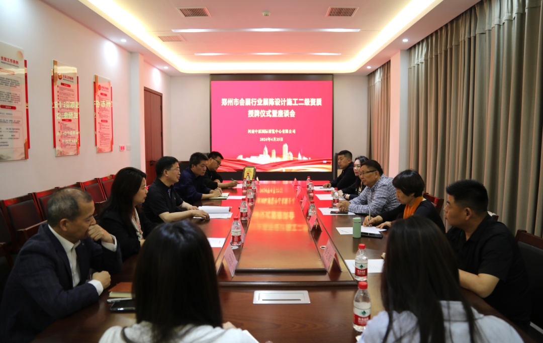 4月25日,郑州会展行业展陈设计施工二级资质授牌仪式暨座谈会在中原国际博览中心举行,中国副食流通协会监事长、郑州会展行业协会会长岳增浦出席授牌仪式,协会党支部副书记邵翠平,秘书长刘亚娜,副会长、搭建商专委会主任李文辉,副会长、河南豫展联会展服务有限公司董事焦鹏,中原国际博览中心总经理梅讯奇,党总支副书记、副总经理李春莉,副总经理周卫阳及展览服务部负责人等参加活动。