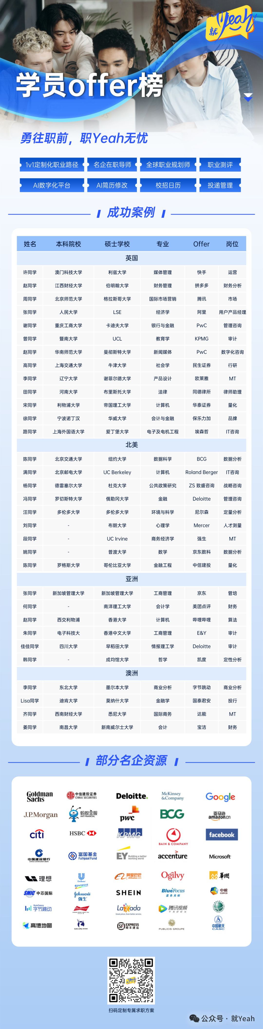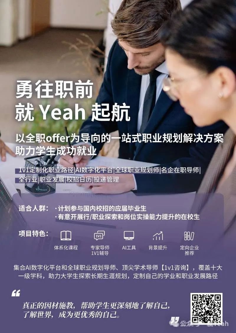 就Yeah通过专业的指导和实战培训,提升你的职业竞争力,帮助学生和求职者在复杂多变的职场环境中找到自己的定位,在职场上更加出色。