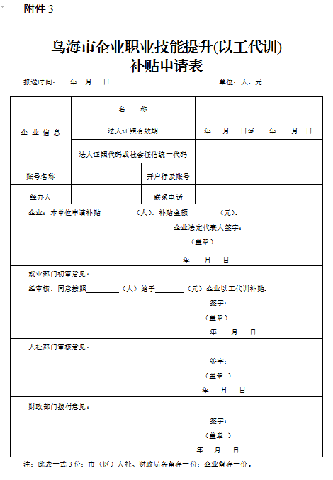1.乌海市企业职业技能提升(以工代训)补贴申请表(附件3);