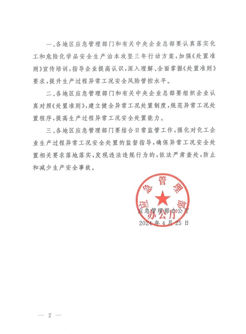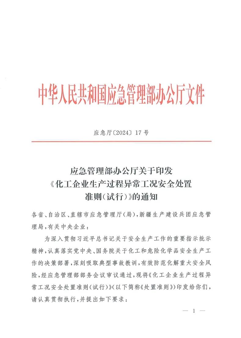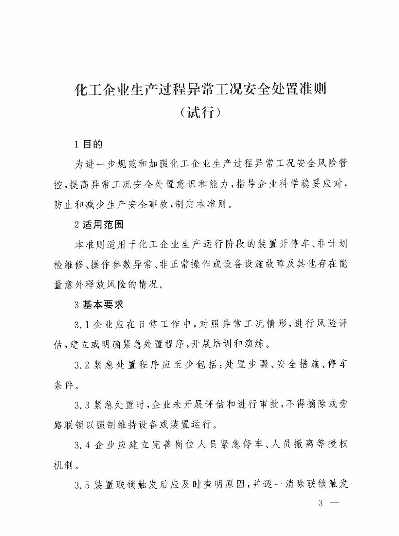 为进一步规范和加强化工企业生产过程异常工况安全风险管控,应急管理部近日印发了《化工企业生产过程异常工况安全处置准则(试行)》。应急管理部要求有关企业认真对照《处置准则》,建立健全异常工况处置制度,规范异常工况处置程序,提高生产过程异常工况安全处置能力。
