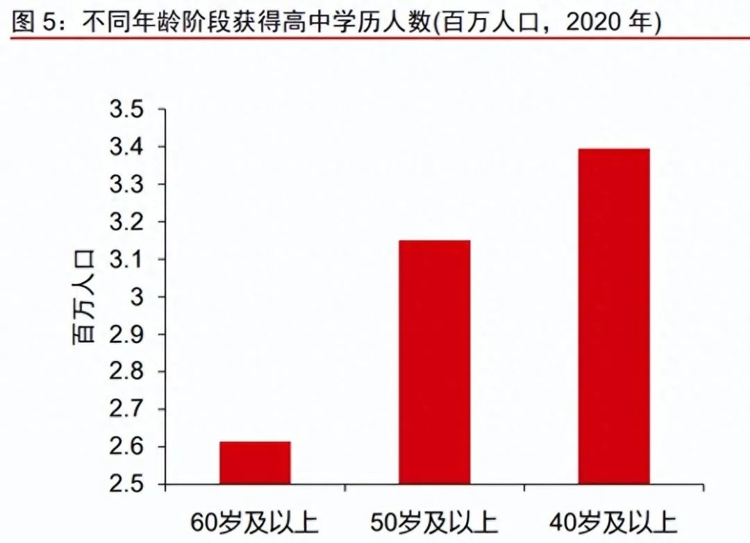 中国老龄化有一个核心特征是代际差异,理解代际转换是把握中国养老产业市场节奏 的关键。当前中国老龄人口以“50 后”为主,“60 后”和“70 后”尚未迈入老龄门槛。对比这两个群体,从人口绝对数量来看,“50”后远不及“60 后”和“70 后”。从教育程 度来看,“50 后”接受更好教育的几率低于后者,因此接受新观念、新事物的能力相对也 不及后者。