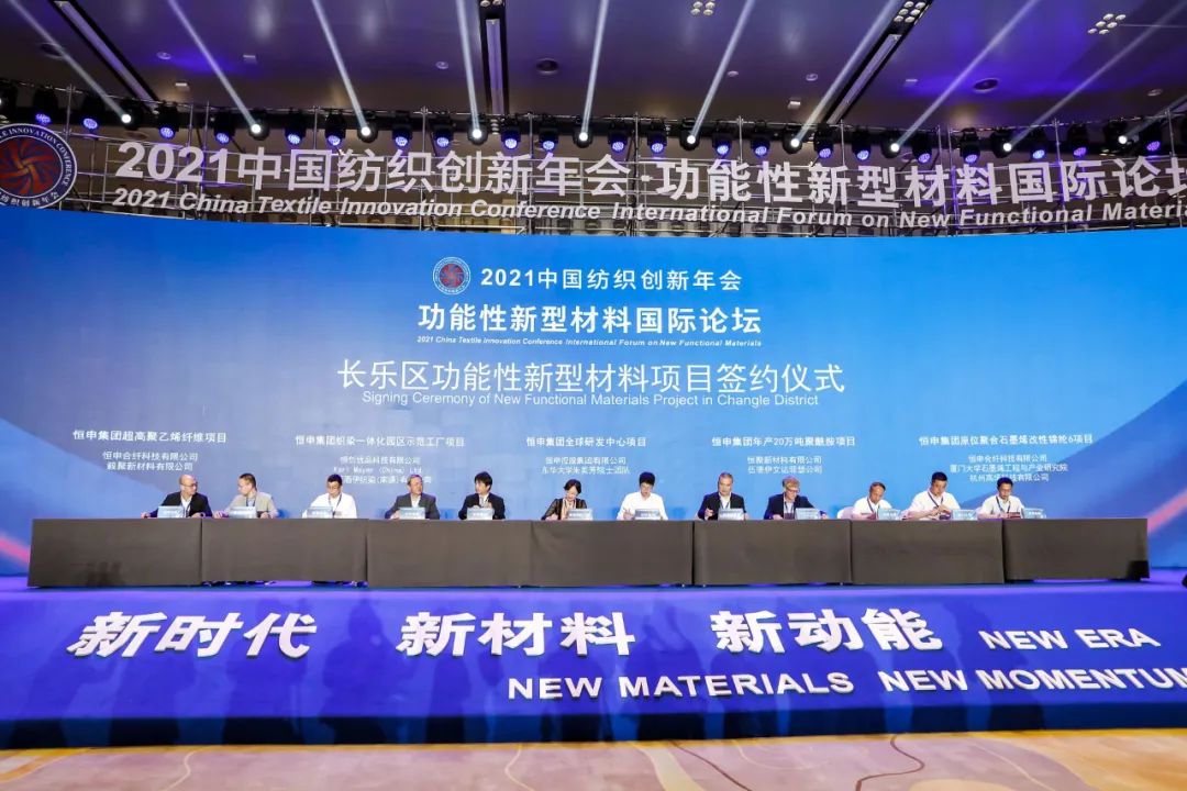 同时,大会还举行了“长乐区政府新型材料产业发展项目签约仪式”、“长乐区功能性新型材料项目签约仪式”。长乐区政府、中国纺织工业联合会、中国科学院福建物质结构研究所、恒申控股集团有限公司、福建永荣锦江股份有限公司、福建长源纺织有限公司、东丽酒伊织染(南通)有限公司、赛得利公司等二十余家单位机构、海内外企业就“功能性新型材料产业发展战略合作暨长乐纺织新材料十四五规划项目”、“稀土改性功能纺织材料研究中心项目”、“恒申集团全球研发中心项目”、“永荣锦江百万吨数智化功能性绿色超纤项目”等14个重大合作项目进行了签约,总投资额逾200亿元。