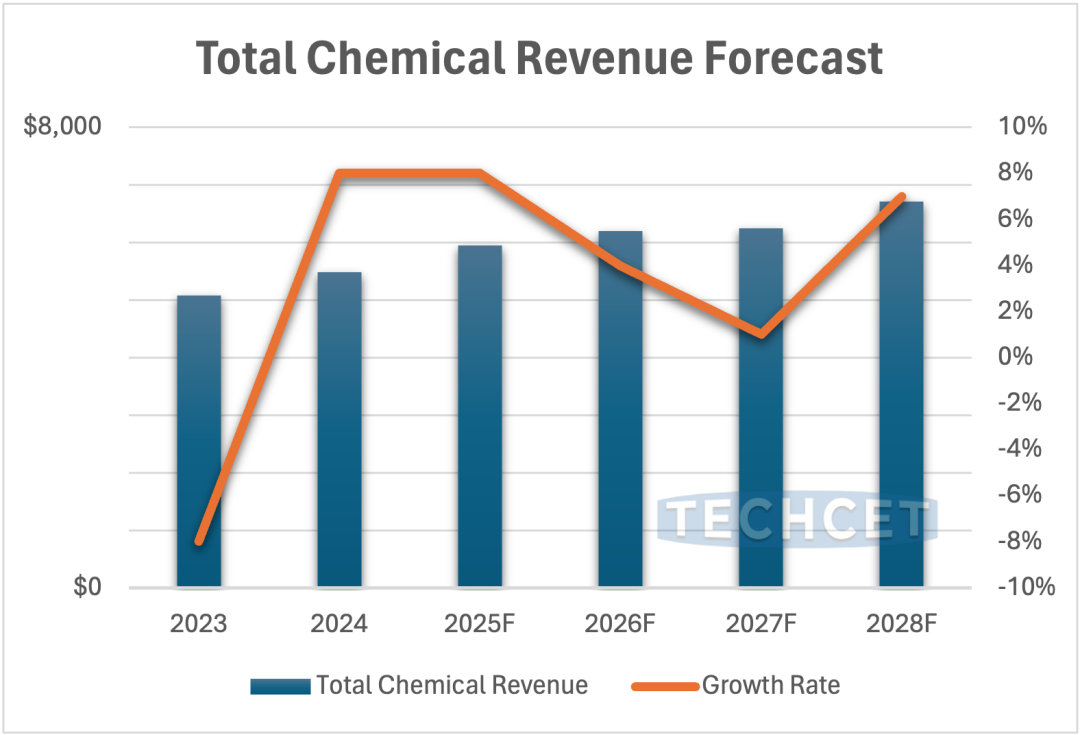 半导体材料市场信息咨询公司TECHCET预计2024 年半导体湿化学品市场将增长 8%,规模将达到 55 亿美元。