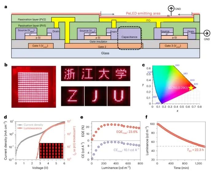 研究人员构筑钙钛矿量子点核壳结构、提出惰性共轭配体,开发强配位膦酸介导合成并结合氢碘酸刻蚀策略,实现纳米表面重构,解决了量子点表面缺陷调控难题,创造了显示用纯红光LED光效和寿命纪录;并进一步为量子点LED量身订制TFT驱动电路,国际首次实现溶液法制备有源矩阵量子点显示芯片。