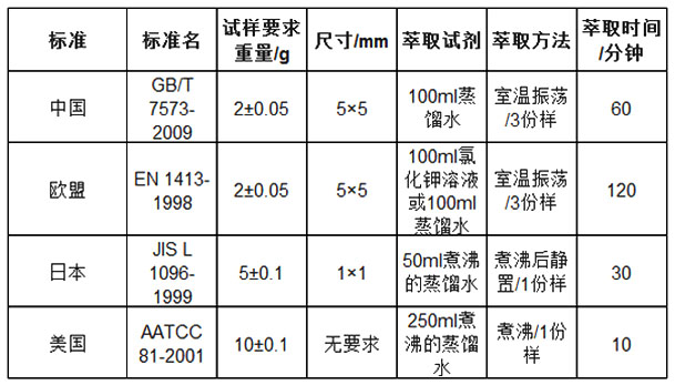 称取3份2±0.05g试样,将其剪成5×5 mm的小块,放入含有100ml蒸馏水的烧瓶中,摇动烧瓶使试样充分浸湿,将烧瓶放在振荡器上振荡2小时±5min后,在室温下用pH计直接测定水萃取液(不含织物)的pH值,每个样品做3次试验,取第二和第三个试样结果的平均值作为最终结果,精确至0.1。