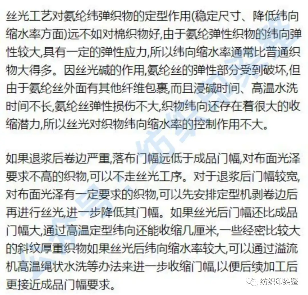 T/R弹力织物因含有粘胶成分遇碱会溶解所以不能丝光,像锦纶、涤纶长丝等化纤弹力织物丝光的意义也不是很大,同时丝光还会对它们有破坏作用,所以可以省略丝光工序。