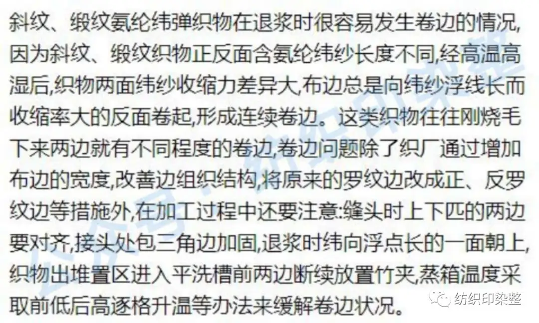 起皱也是退浆过程中的常见问题之一,一般品种经丝光工序后很容易消除,对于一些牛津纺结构的素色弹力织物的退浆,如果有卷染设备的情况下,可以采用卷染机淀粉酶退浆,减少折皱印的发生。