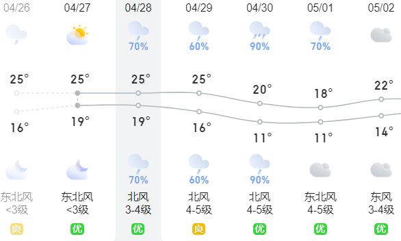 今日小雨,气温19-25度,北风3-4级,体感温度