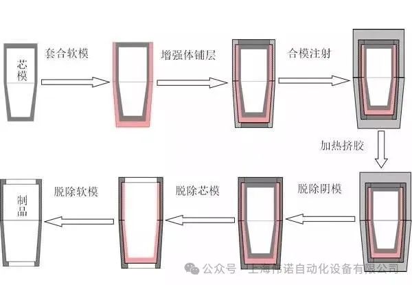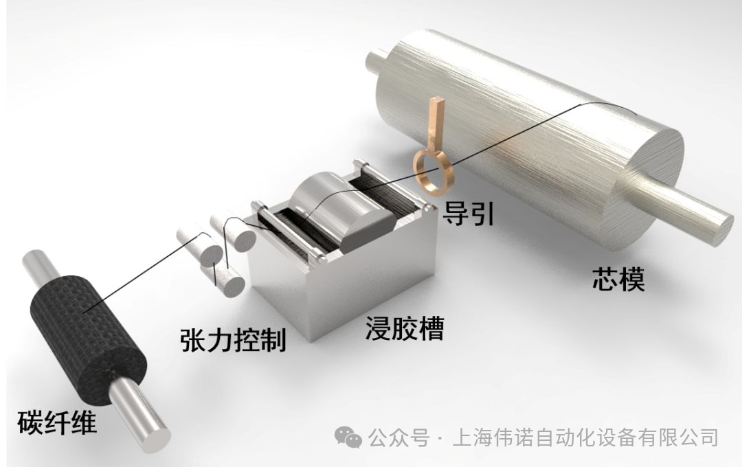 纤维缠绕技术作为一种成型技术,通过丝嘴和模具之间的相对运动,按照一定的规则将纱线束缠绕在模具上,从而制成复合材料组件。纤维缠绕过程是按照一定的规则,将浸渍有树脂胶的连续纤维或布带缠绕在芯模上,然后将其固化和脱模。纤维缠绕复合材料的成型工艺是目前使用最广泛效率最高、成型效果最好的成型工艺,其产品性能均匀、稳定,也是最早开发和广泛使用的技术。纤维缠绕成型工艺是指在纤维张力的作用下,将纤维纱片浸入树脂胶中,通过控制丝嘴与型芯模具之间的相对运动,将纤维缠绕在型芯模具上:以一定的编排规律做出复合材料零件的成型技术
