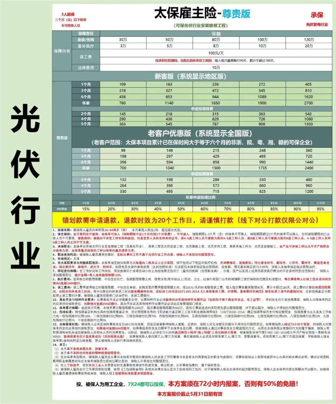 大保司承保 3人起保,最高可做120万,仅保光伏安装工。1、门诊不赔误工费,出险须到二级及以上公立医院就诊才能赔 2、发生伤残或身故案件,必须有高空作业证、安全带及特种作业证,缺少其一会有25%免赔。免赔是整案免赔,如伤残案件是包括伤残赔偿金、医疗费、误工费等所有赔偿进行免赔。3、出险请72小时内报案,超时免赔50%没有通融的。4、本方案不退保不减员,一个月、三个月的保单不替换,六个月的保单除出过险的人员不能替换,其他可以替换。 8、投保人名称中含有以下所列关键词的禁止投保年单:咨询、劳务、人力、人资、人才、派遣、外包、就业、企业服务、企业管理。
