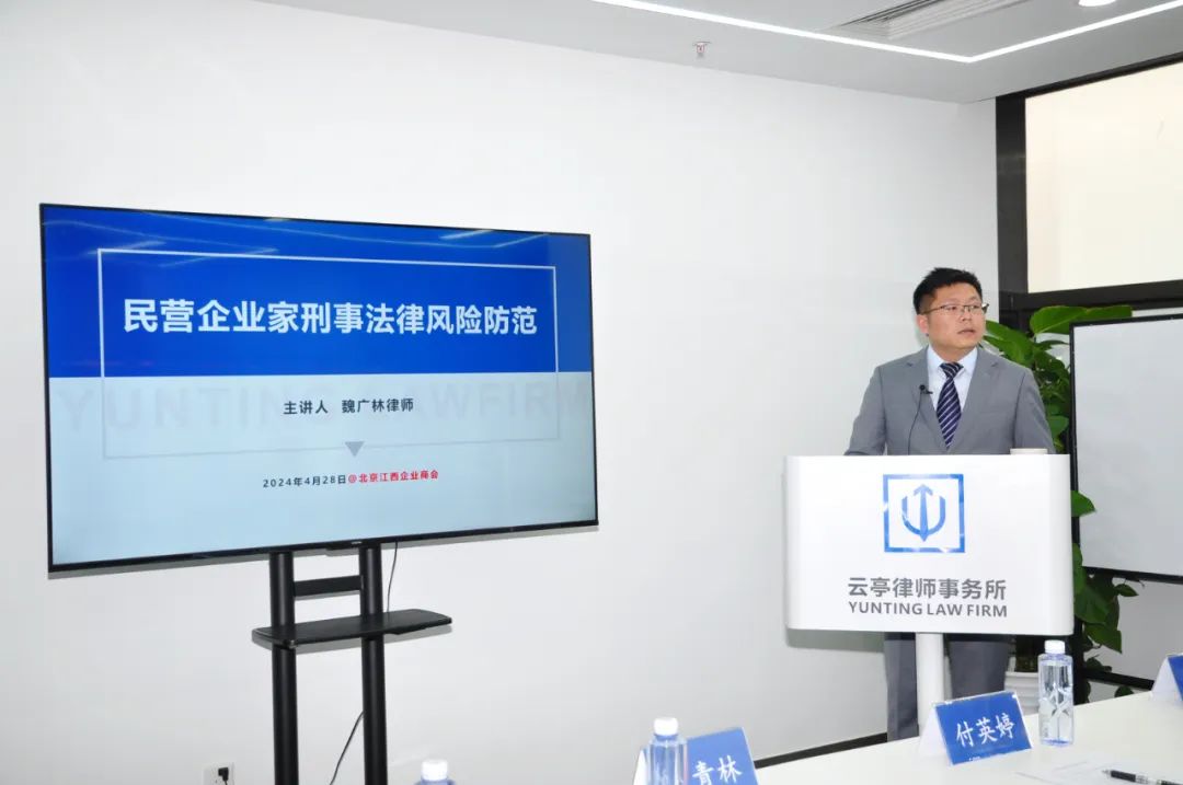 2024年4月28日,北京江西企业商会在监事魏广林单位——北京云亭律师事务所举办法律大讲堂活动,助力会员企业提升法律意识和风险防范能力。北京江西企业商会常务副会长、法律服务中心主任王才亮主持会议。副会长付英婷,执行会长李孝轩、章凌波单位代表,常务副会长陈华单位代表,理事周辉、钟志花、袁慧芳、杨海兵、程莹、翁平云,会员朱春晖、刘天越、裘名亮、刘奀木、刘玉、胡莱茜、曾慧,以及执行秘书长毛祖棠,秘书长助理、会员部部长黄青,云亭律师事务所创始合伙人唐青林律师,商会监事、云亭金融专委会主任魏广林律师,云亭资本市场专委会主任张昇立律师,云亭争议解决专委会主任彭镇坤律师,云亭金融专委会委员梁勇律师等参加活动。