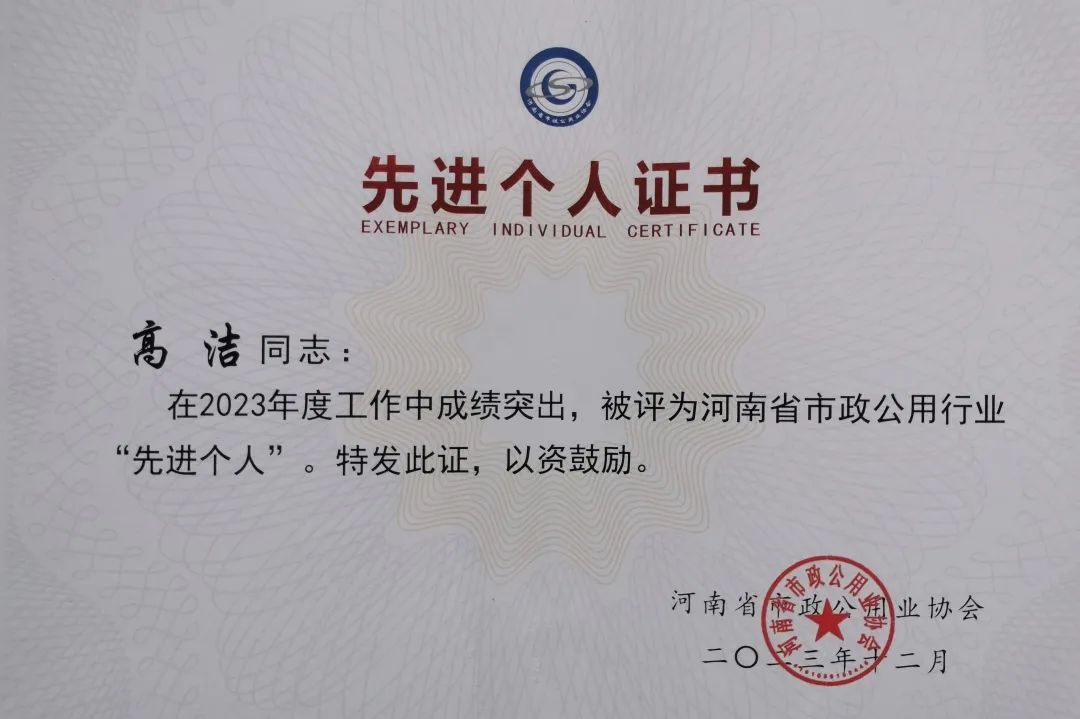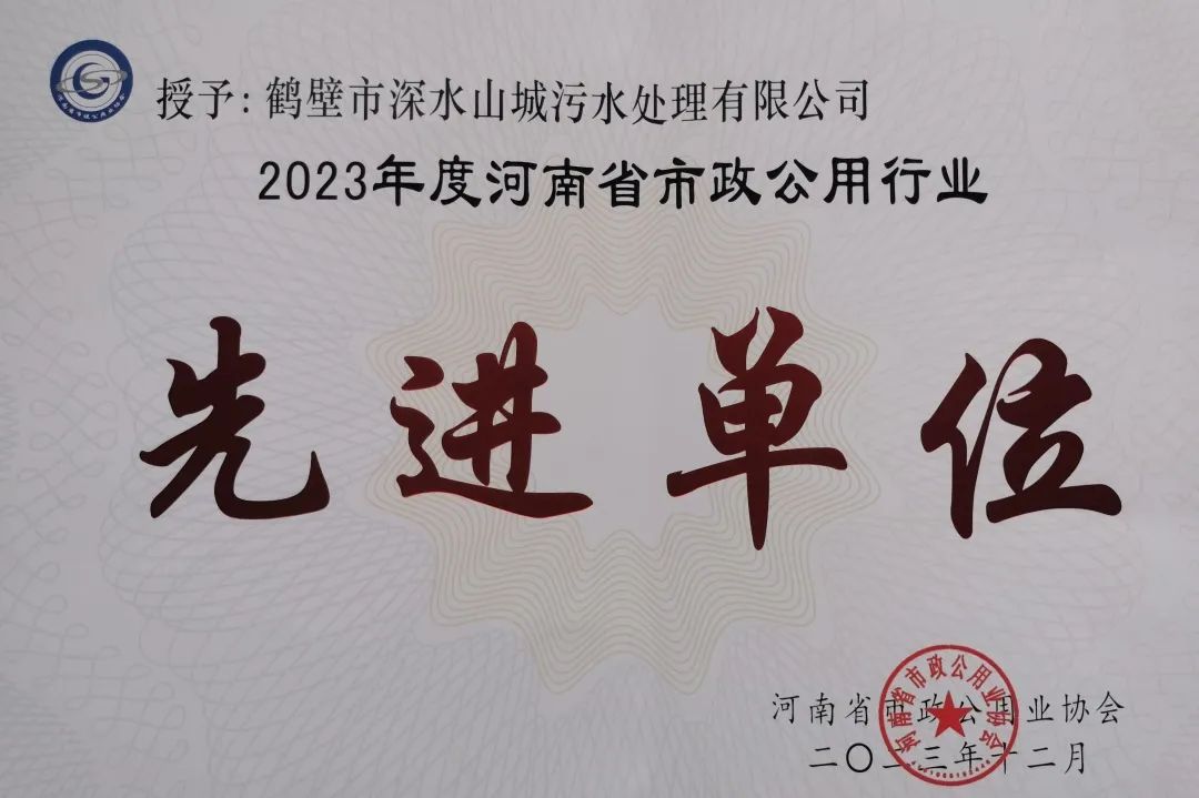 日前,鹤壁山城污水处理公司荣获2023年度河南省市政公用行业“先进单位”,董事长高洁荣获“先进个人”荣誉称号。