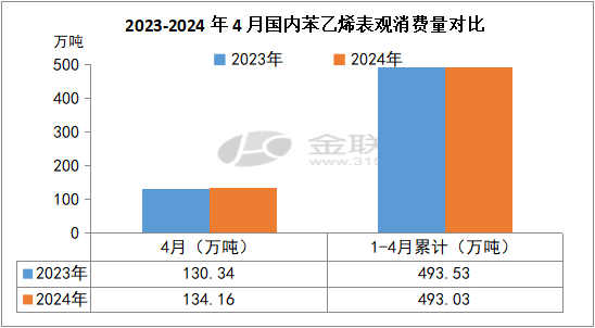 据金联创统计数据显示,2024年4月份我国苯乙烯表观消费量约134.16万吨,同比增加3.82万吨,增幅2.93%。1-4月我国苯乙烯表观消费量合计约493.03万吨,同比略降0.5万吨,降幅0.10%。(备注:表观消费量=产量+进口量-出口量±港口库存差)