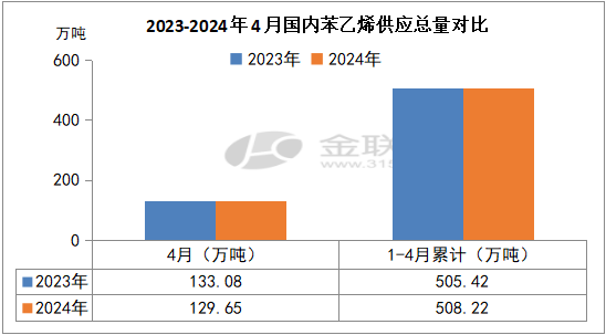 据金联创统计数据显示,2024年4月我国苯乙烯供应量合计约129.65万吨,同比下降3.43万吨,降幅2.58%。2024年1-4月我国苯乙烯供应总量合计约508.22万吨,较2023年同比增加2.8万吨,增幅0.55%。