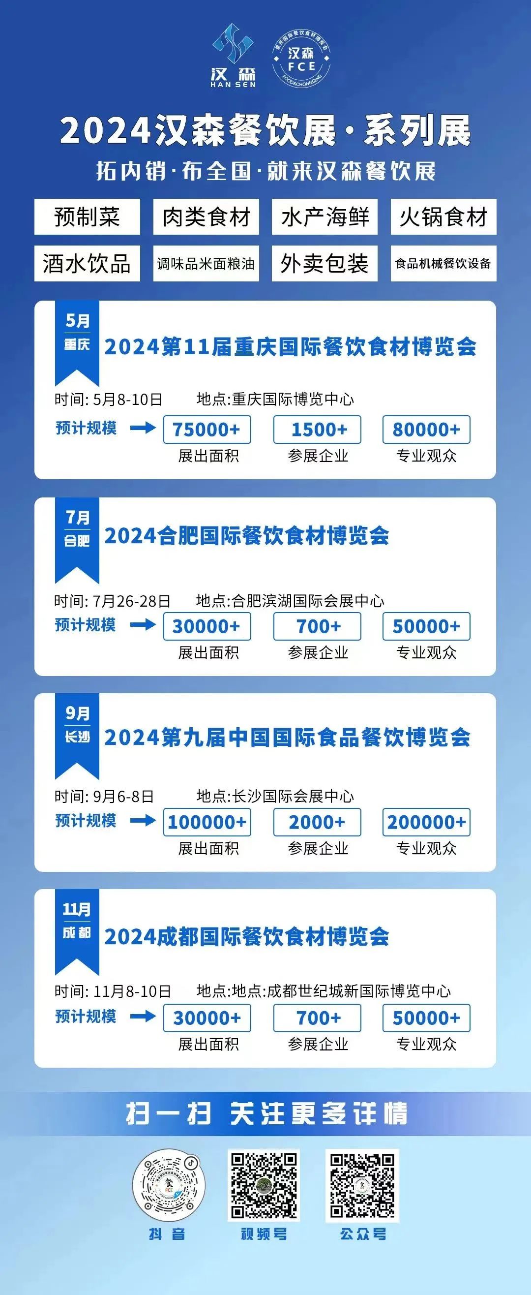 汉森餐博会布局西部地区重庆展、成都展、华中地区武汉展、华中地区长沙展、华东地区合肥展华北地区北京展,数年来共服务餐饮行业客户9000余家上万品牌,共接待餐饮行业专业人士50余万人,经过多年的积累和发展,展会规模和行业影响力已有较大的提升,在提升展会品质的同时,还将加强和推进餐饮业的发展,为中高端的酒店、饭店、餐饮公司、采购商、经销商、代理商及批发商等专业人士,提供解决方案的一-站式采购贸易平台。汉森展览将秉承-如既往、服务至上、产业共荣,用心做好重庆餐博会,为餐饮业业内人士传递前沿资讯、发展趋势报告、大咖经营思维、盈利秘笈等精彩内容。