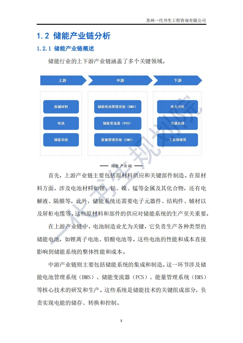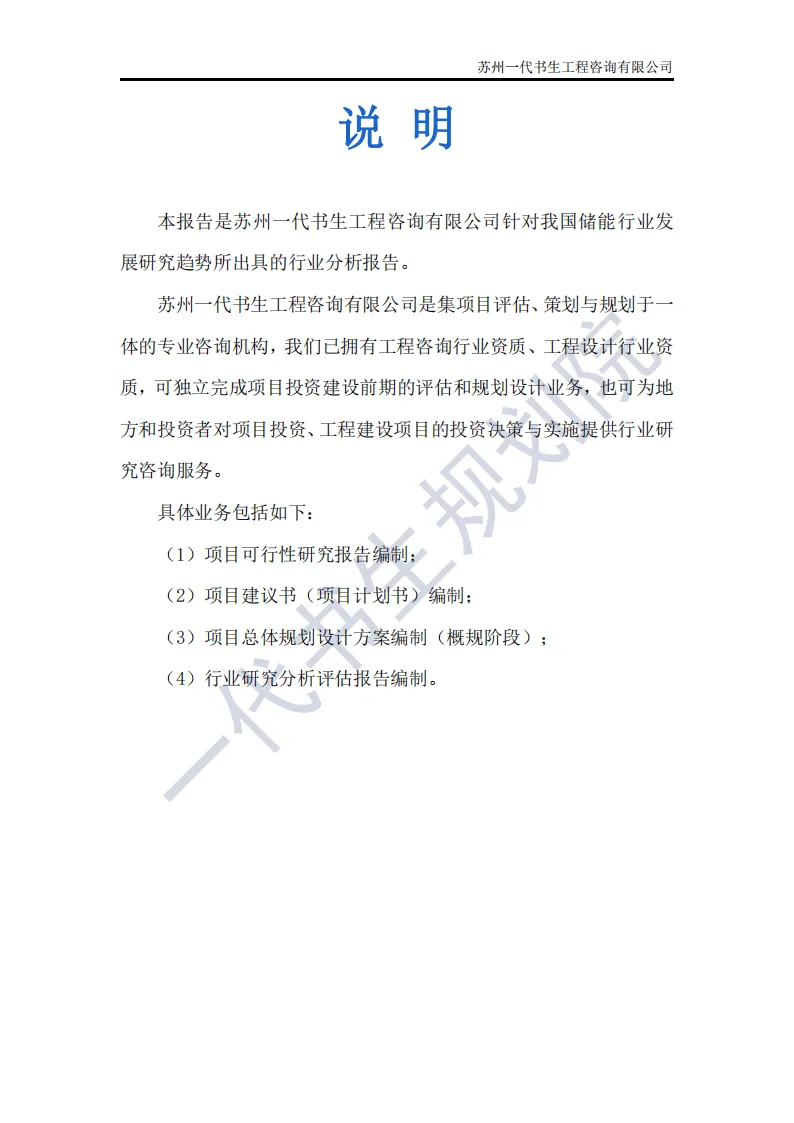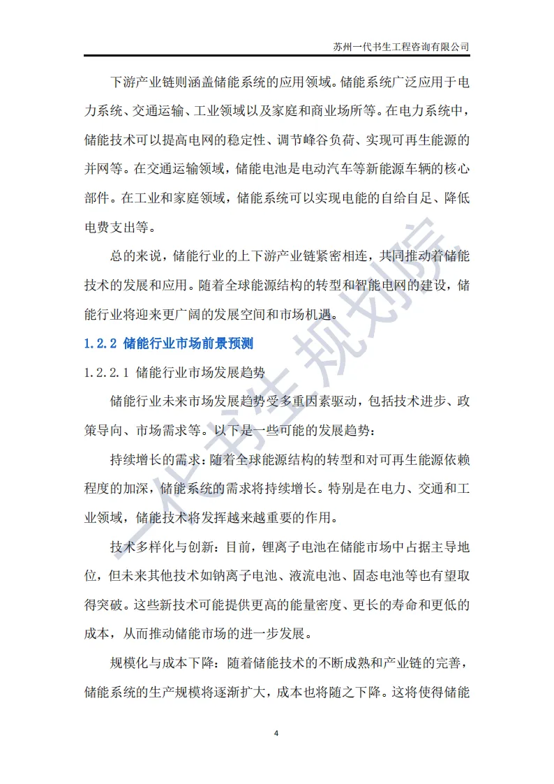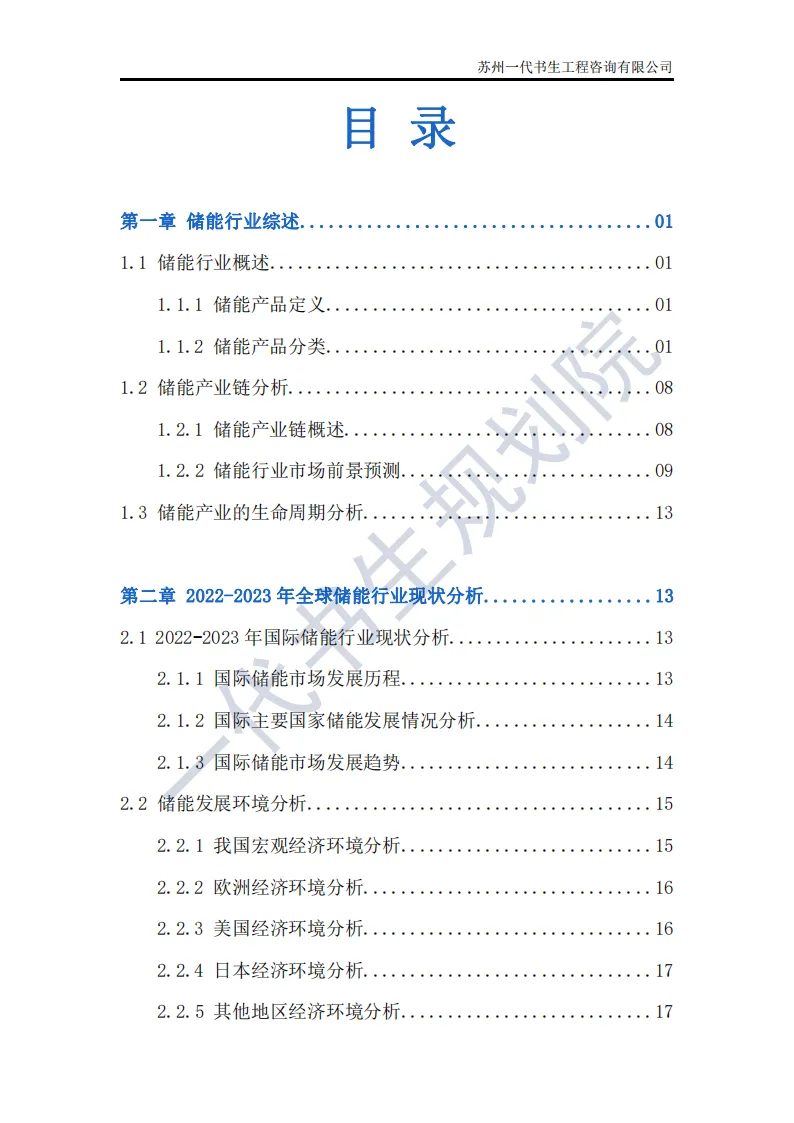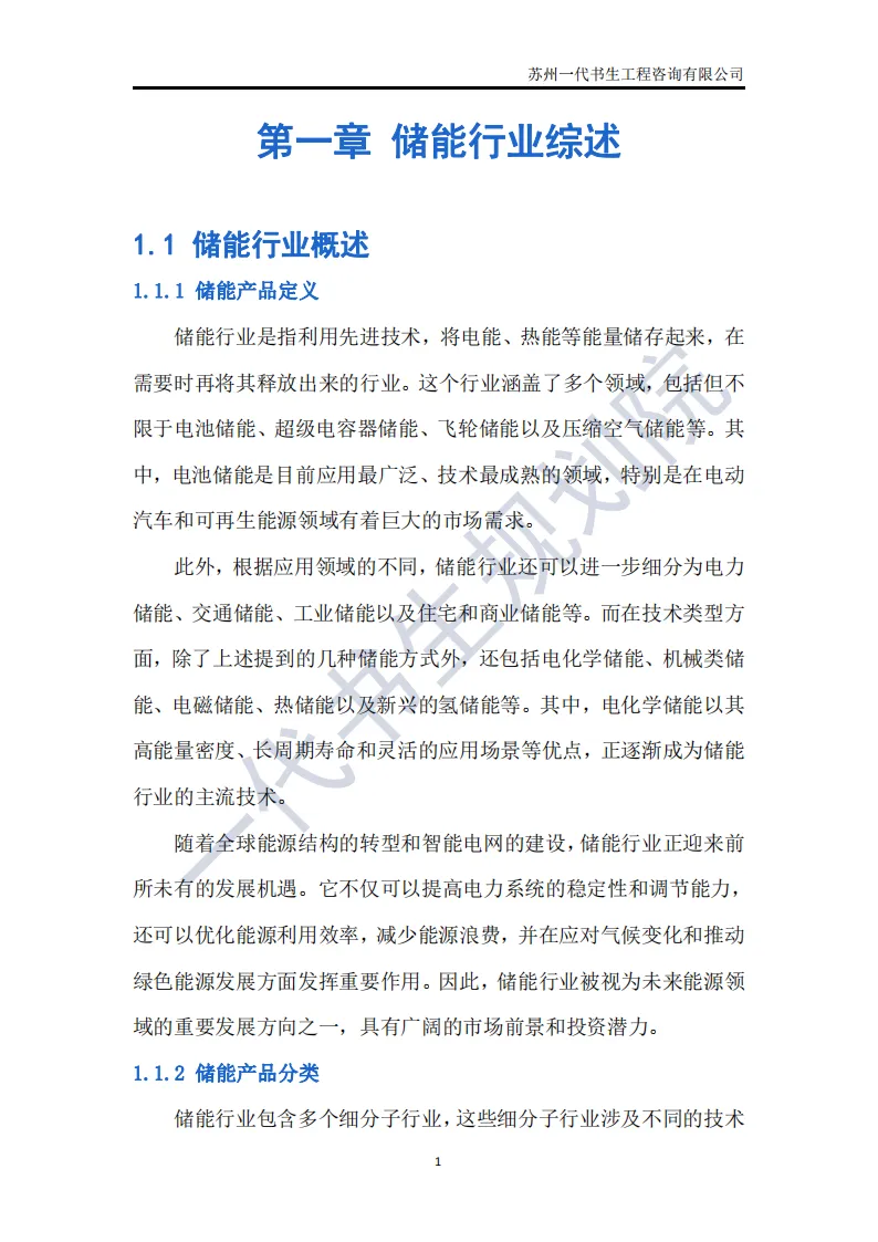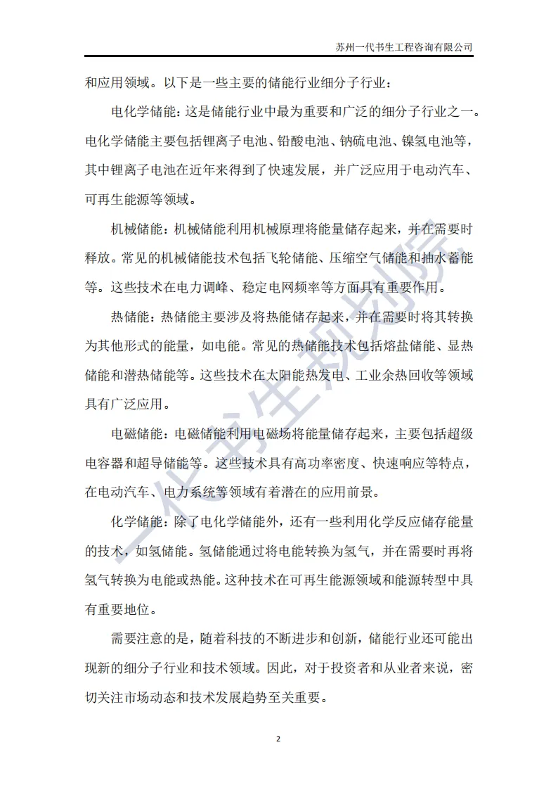 储能行业是指利用先进技术,将电能、热能等能量储存起来,在需要时再将其释放出来的行业。这个行业涵盖了多个领域,包括但不限于电池储能、超级电容器储能、飞轮储能以及压缩空气储能等。其中,电池储能是目前应用最广泛、技术最成熟的领域,特别是在电动汽车和可再生能源领域有着巨大的市场需求。根据一代书生规划院对储能行业的研究,我们认为储能行业主要可以分为以下几个类别。第一,电化学储能:这是储能行业中最为重要和广泛的细分子行业之一。电化学储能主要包括锂离子电池、铅酸电池、钠硫电池、镍氢电池等,其中锂离子电池在近年来得到了快速发展,并广泛应用于电动汽车、可再生能源等领域。第二,机械储能:机械储能利用机械原理将能量储存起来,并在需要时释放。常见的机械储能技术包括飞轮储能、压缩空气储能和抽水蓄能等。这些技术在电力调峰、稳定电网频率等方面具有重要作用。第三,热储能:热储能主要涉及将热能储存起来,并在需要时将其转换为其他形式的能量,如电能。常见的热储能技术包括熔盐储能、显热储能和潜热储能等。这些技术在太阳能热发电、工业余热回收等领域具有广泛应用。第四,电磁储能:电磁储能利用电磁场将能量储存起来,主要包括超级电容器和超导储能等。这些技术具有高功率密度、快速响应等特点,在电动汽车、电力系统等领域有着潜在的应用前景。第五,化学储能:除了电化学储能外,还有一些利用化学反应储存能量的技术,如氢储能。氢储能通过将电能转换为氢气,并在需要时再将氢气转换为电能或热能。这种技术在可再生能源领域和能源转型中具有重要地位。我国储能产业链上、中、下游已形成了一个完整、协同的生态体系。储能产业的上游产业链主要包括原材料供应和关键部件制造;中游产业链则主要包括储能系统的集成和制造;《2024年-2029年我国储能产业市场发展研究分析报告》行业分析研究报告编制单位为苏州一代书生工程咨询有限公司。第一,持续增长的需求:随着全球能源结构的转型和对可再生能源依赖程度的加深,储能系统的需求将持续增长。特别是在电力、交通和工业领域,储能技术将发挥越来越重要的作用。第二,技术多样化与创新:目前,锂离子电池在储能市场中占据主导地位,但未来其他技术如钠离子电池、液流电池、固态电池等也有望取得突破。这些新技术可能提供更高的能量密度、更长的寿命和更低的成本,从而推动储能市场的进一步发展。第三,规模化与成本下降:随着储能技术的不断成熟和产业链的完善,储能系统的生产规模将逐渐扩大,成本也将随之下降。这将使得储能技术更加经济实用,进一步加速其在各个领域的应用。第四,智能化与集成化:未来储能系统将更加智能化和集成化,能够与智能电网、分布式能源系统等更好地协同工作。通过先进的能量管理系统和物联网技术,储能系统可以实现实时监控、优化调度和自适应控制,提高能源利用效率和系统稳定性。第五,政策支持与市场机制完善:各国政府将继续出台支持储能行业发展的政策,包括补贴、税收优惠、研发资助等。同时,电力市场机制的完善也将为储能技术提供更好的市场环境,如建立合理的电价结构和允许储能系统参与电力市场交易等。第六,全球市场拓展:目前,储能市场的发展主要集中在一些发达国家和地区。未来,随着全球能源转型的深入推进,其他国家和地区特别是发展中国家也将逐渐成为储能市场的重要增长点。