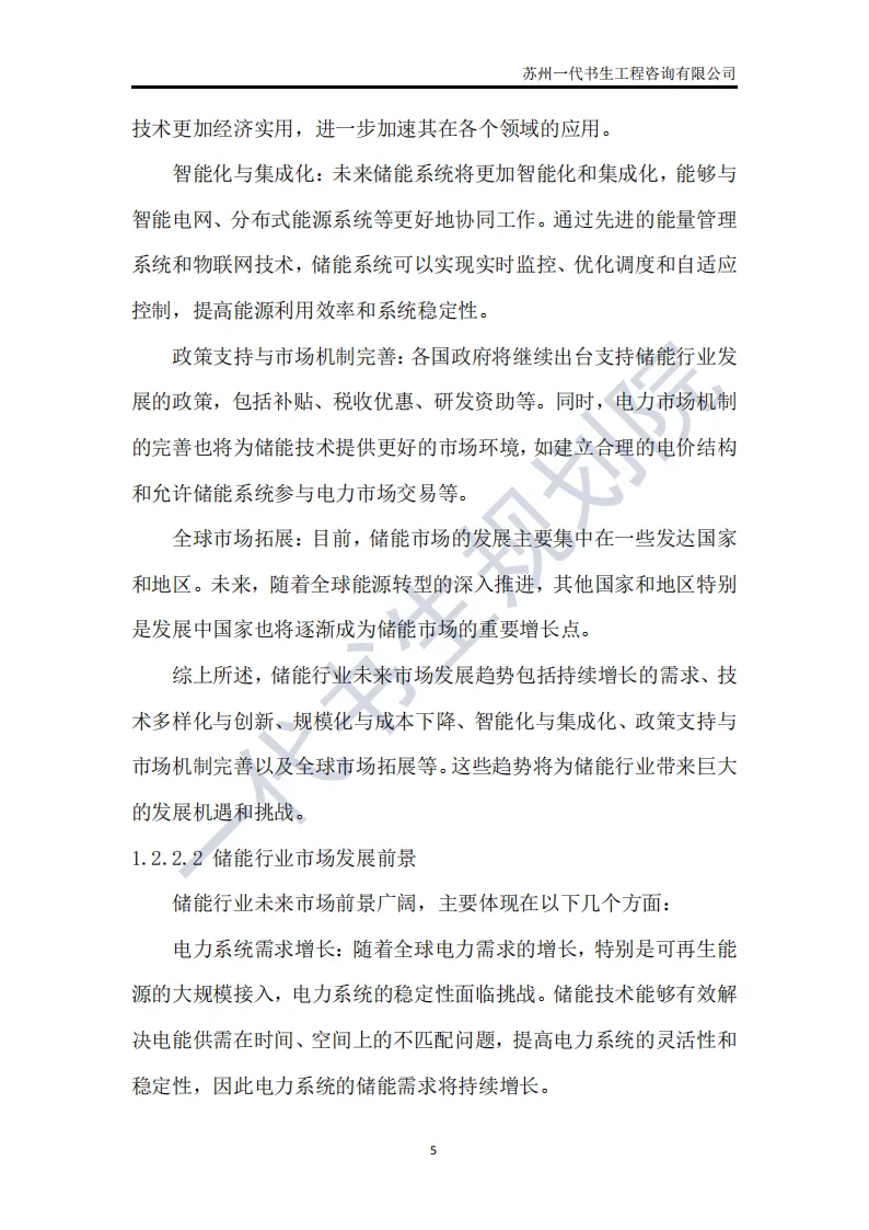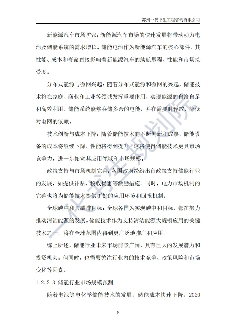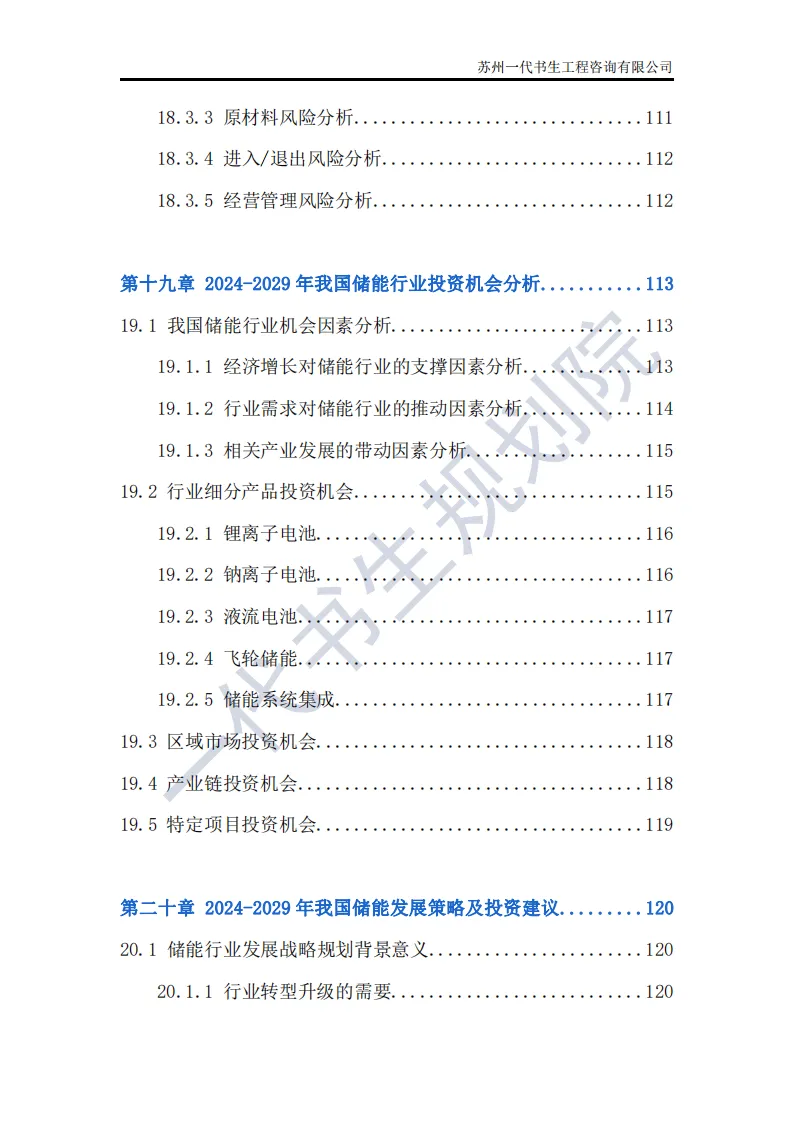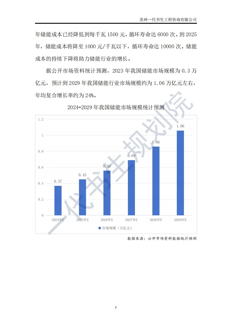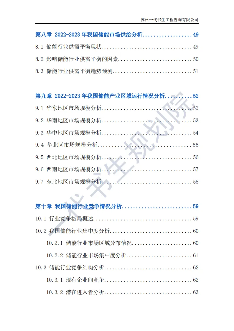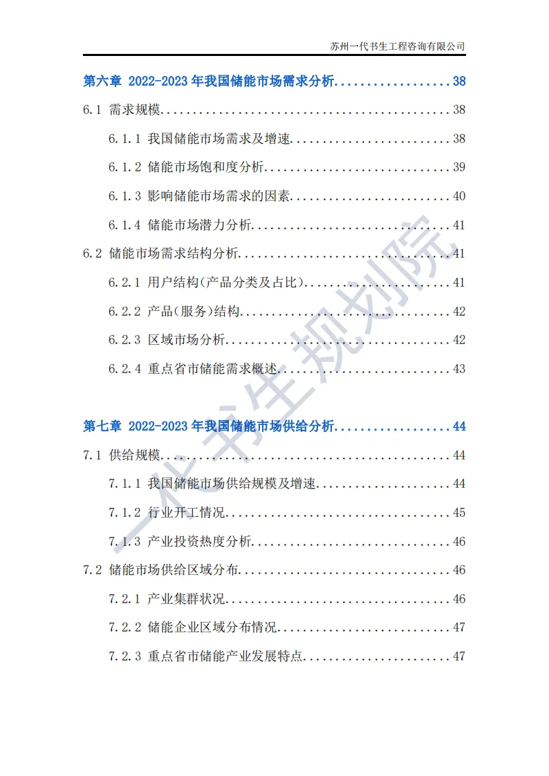 储能行业是指利用先进技术,将电能、热能等能量储存起来,在需要时再将其释放出来的行业。这个行业涵盖了多个领域,包括但不限于电池储能、超级电容器储能、飞轮储能以及压缩空气储能等。其中,电池储能是目前应用最广泛、技术最成熟的领域,特别是在电动汽车和可再生能源领域有着巨大的市场需求。根据一代书生规划院对储能行业的研究,我们认为储能行业主要可以分为以下几个类别。第一,电化学储能:这是储能行业中最为重要和广泛的细分子行业之一。电化学储能主要包括锂离子电池、铅酸电池、钠硫电池、镍氢电池等,其中锂离子电池在近年来得到了快速发展,并广泛应用于电动汽车、可再生能源等领域。第二,机械储能:机械储能利用机械原理将能量储存起来,并在需要时释放。常见的机械储能技术包括飞轮储能、压缩空气储能和抽水蓄能等。这些技术在电力调峰、稳定电网频率等方面具有重要作用。第三,热储能:热储能主要涉及将热能储存起来,并在需要时将其转换为其他形式的能量,如电能。常见的热储能技术包括熔盐储能、显热储能和潜热储能等。这些技术在太阳能热发电、工业余热回收等领域具有广泛应用。第四,电磁储能:电磁储能利用电磁场将能量储存起来,主要包括超级电容器和超导储能等。这些技术具有高功率密度、快速响应等特点,在电动汽车、电力系统等领域有着潜在的应用前景。第五,化学储能:除了电化学储能外,还有一些利用化学反应储存能量的技术,如氢储能。氢储能通过将电能转换为氢气,并在需要时再将氢气转换为电能或热能。这种技术在可再生能源领域和能源转型中具有重要地位。我国储能产业链上、中、下游已形成了一个完整、协同的生态体系。储能产业的上游产业链主要包括原材料供应和关键部件制造;中游产业链则主要包括储能系统的集成和制造;《2024年-2029年我国储能产业市场发展研究分析报告》行业分析研究报告编制单位为苏州一代书生工程咨询有限公司。第一,持续增长的需求:随着全球能源结构的转型和对可再生能源依赖程度的加深,储能系统的需求将持续增长。特别是在电力、交通和工业领域,储能技术将发挥越来越重要的作用。第二,技术多样化与创新:目前,锂离子电池在储能市场中占据主导地位,但未来其他技术如钠离子电池、液流电池、固态电池等也有望取得突破。这些新技术可能提供更高的能量密度、更长的寿命和更低的成本,从而推动储能市场的进一步发展。第三,规模化与成本下降:随着储能技术的不断成熟和产业链的完善,储能系统的生产规模将逐渐扩大,成本也将随之下降。这将使得储能技术更加经济实用,进一步加速其在各个领域的应用。第四,智能化与集成化:未来储能系统将更加智能化和集成化,能够与智能电网、分布式能源系统等更好地协同工作。通过先进的能量管理系统和物联网技术,储能系统可以实现实时监控、优化调度和自适应控制,提高能源利用效率和系统稳定性。第五,政策支持与市场机制完善:各国政府将继续出台支持储能行业发展的政策,包括补贴、税收优惠、研发资助等。同时,电力市场机制的完善也将为储能技术提供更好的市场环境,如建立合理的电价结构和允许储能系统参与电力市场交易等。第六,全球市场拓展:目前,储能市场的发展主要集中在一些发达国家和地区。未来,随着全球能源转型的深入推进,其他国家和地区特别是发展中国家也将逐渐成为储能市场的重要增长点。