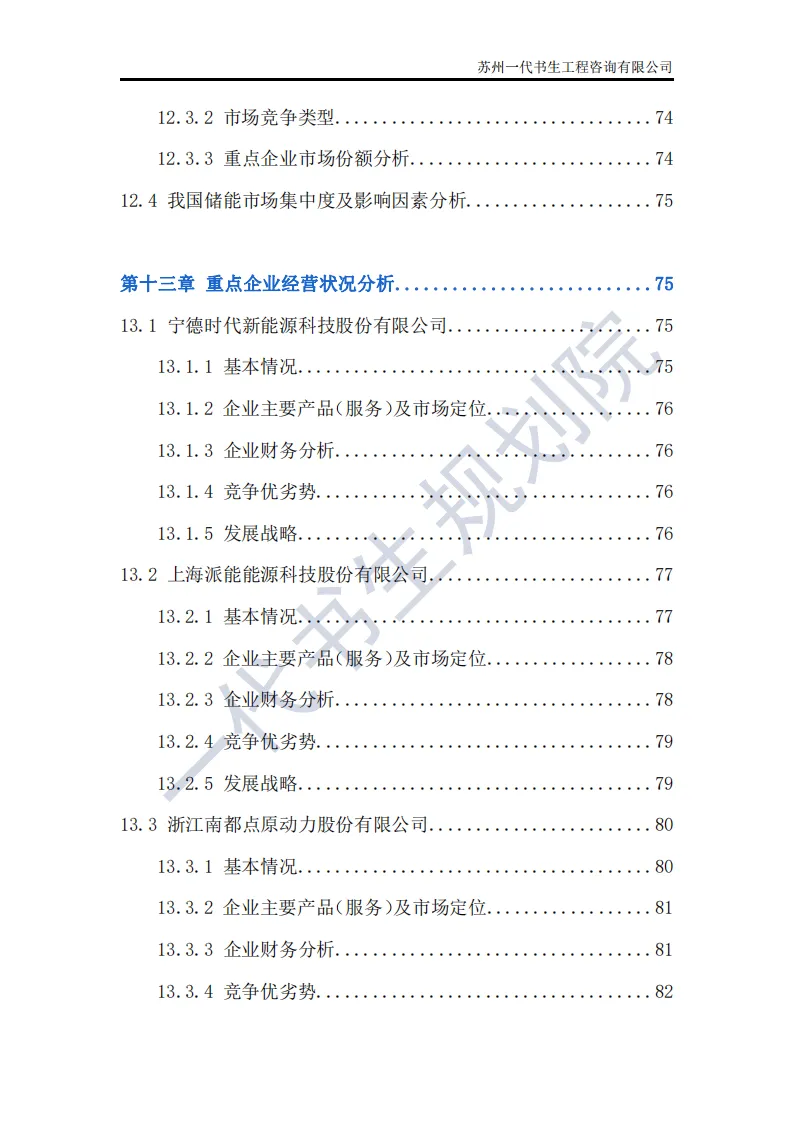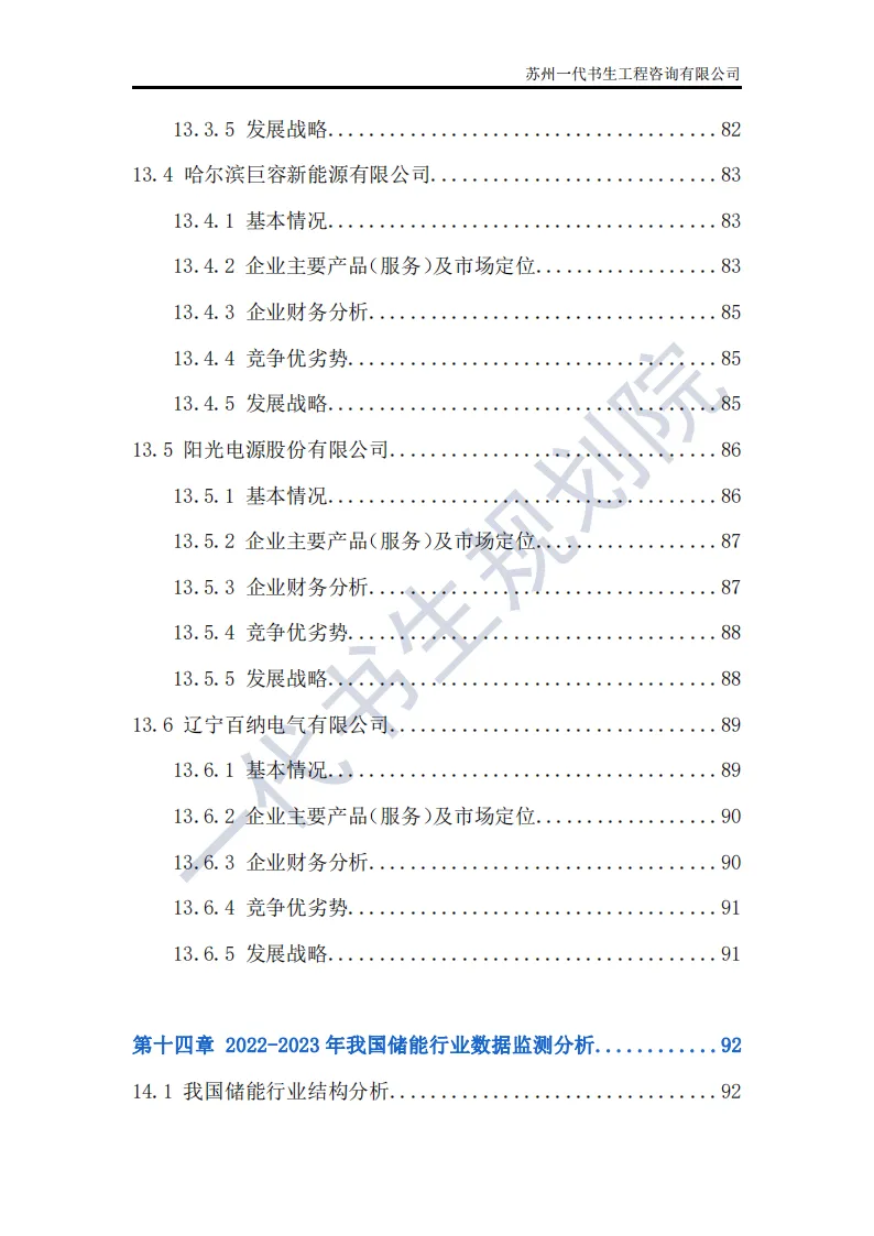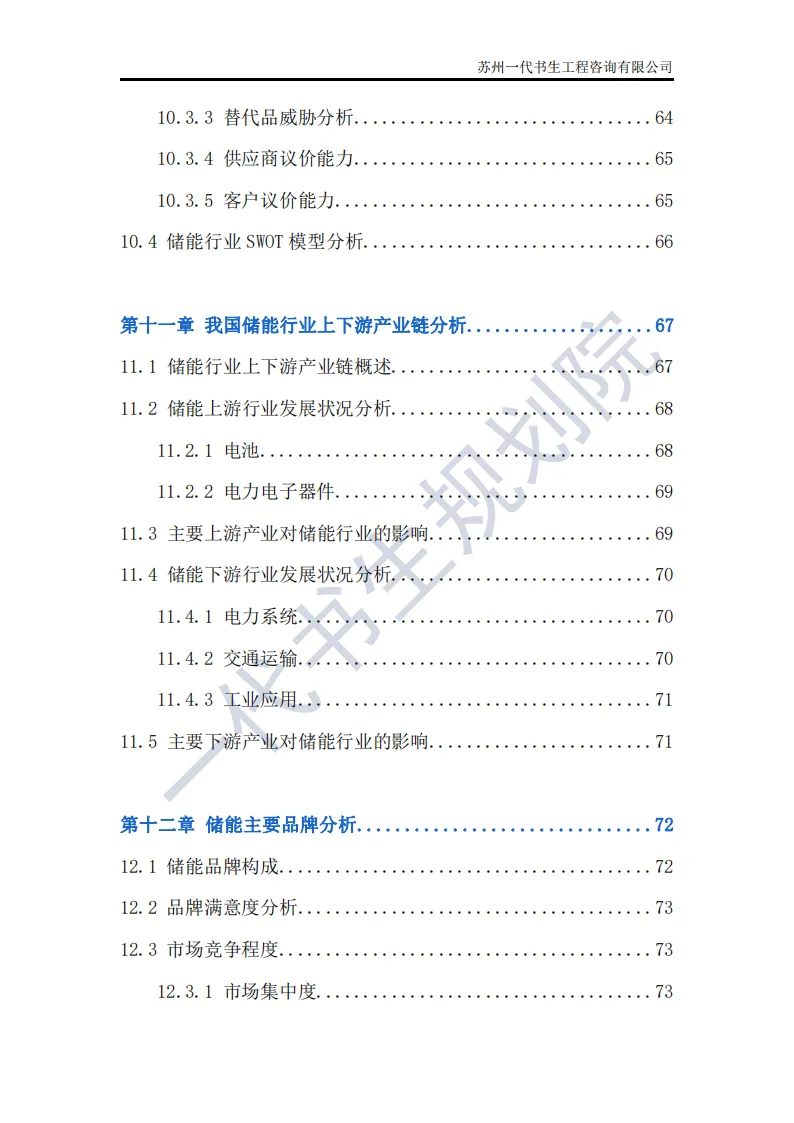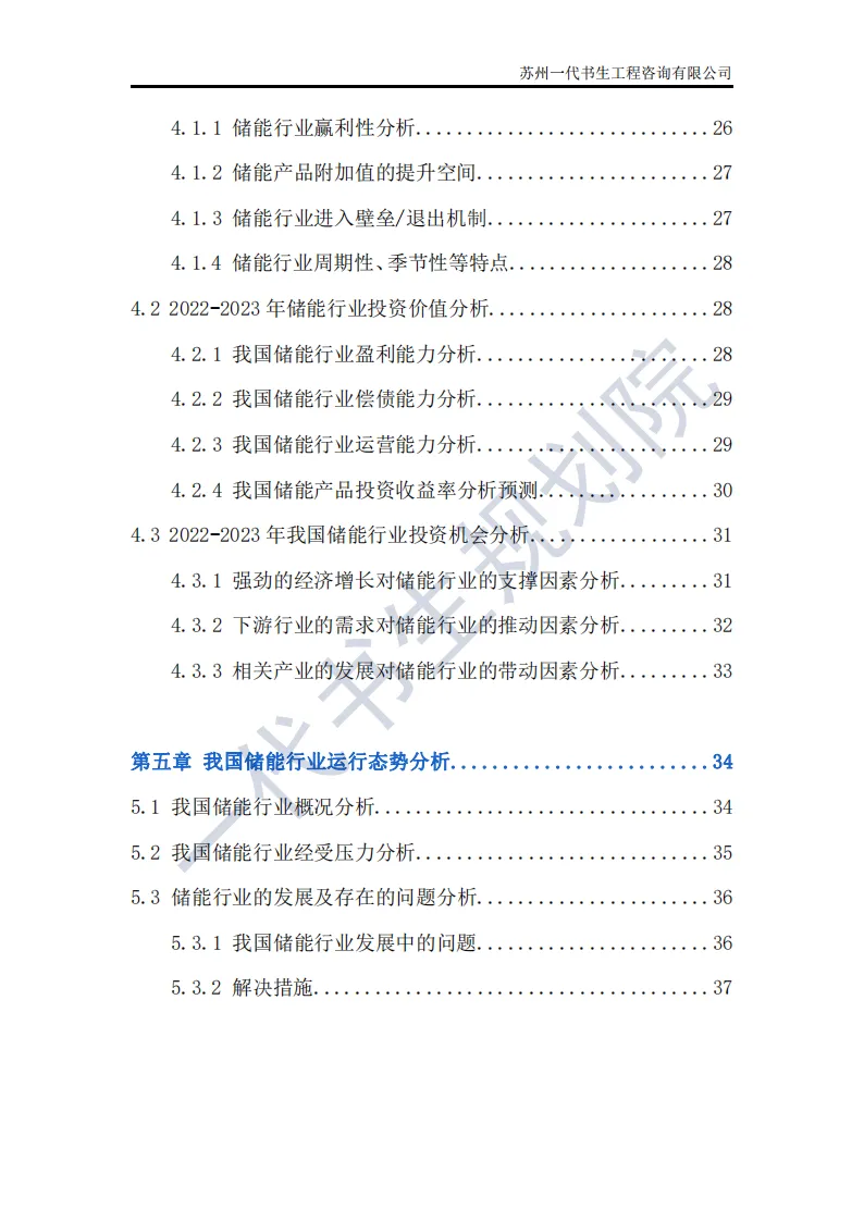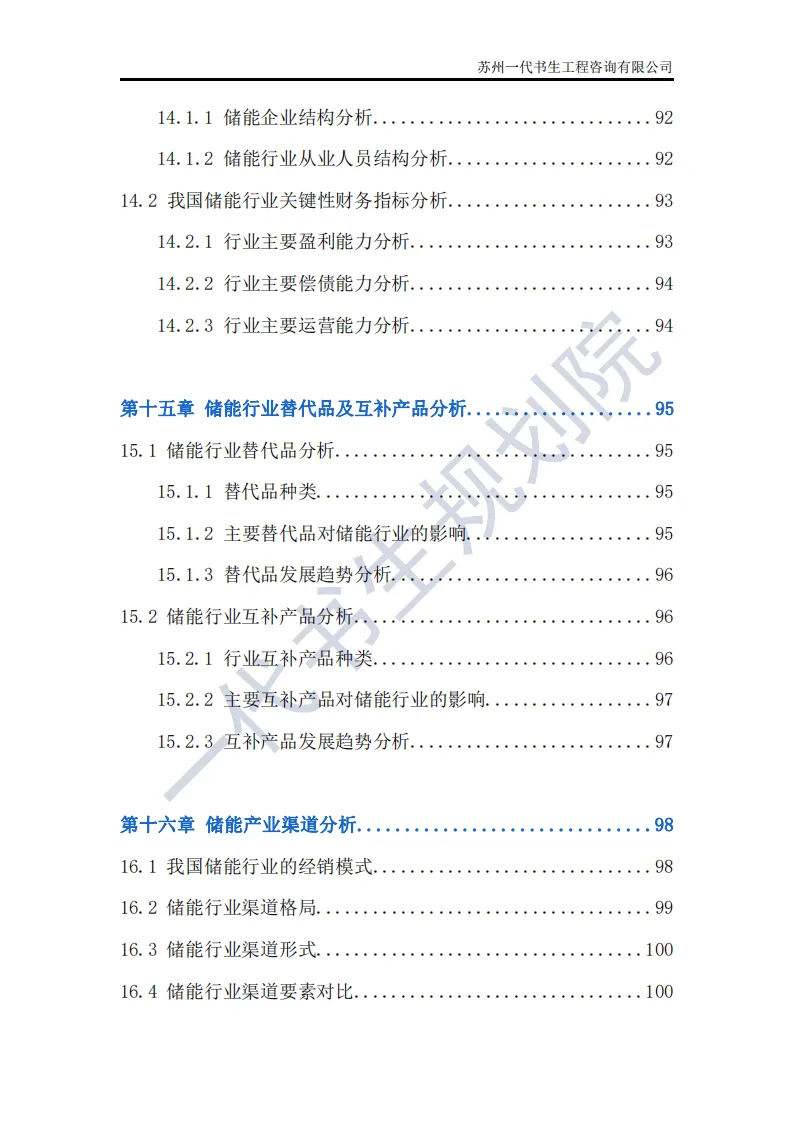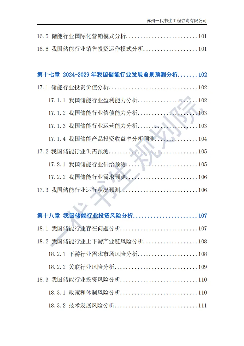 储能行业是指利用先进技术,将电能、热能等能量储存起来,在需要时再将其释放出来的行业。这个行业涵盖了多个领域,包括但不限于电池储能、超级电容器储能、飞轮储能以及压缩空气储能等。其中,电池储能是目前应用最广泛、技术最成熟的领域,特别是在电动汽车和可再生能源领域有着巨大的市场需求。根据一代书生规划院对储能行业的研究,我们认为储能行业主要可以分为以下几个类别。第一,电化学储能:这是储能行业中最为重要和广泛的细分子行业之一。电化学储能主要包括锂离子电池、铅酸电池、钠硫电池、镍氢电池等,其中锂离子电池在近年来得到了快速发展,并广泛应用于电动汽车、可再生能源等领域。第二,机械储能:机械储能利用机械原理将能量储存起来,并在需要时释放。常见的机械储能技术包括飞轮储能、压缩空气储能和抽水蓄能等。这些技术在电力调峰、稳定电网频率等方面具有重要作用。第三,热储能:热储能主要涉及将热能储存起来,并在需要时将其转换为其他形式的能量,如电能。常见的热储能技术包括熔盐储能、显热储能和潜热储能等。这些技术在太阳能热发电、工业余热回收等领域具有广泛应用。第四,电磁储能:电磁储能利用电磁场将能量储存起来,主要包括超级电容器和超导储能等。这些技术具有高功率密度、快速响应等特点,在电动汽车、电力系统等领域有着潜在的应用前景。第五,化学储能:除了电化学储能外,还有一些利用化学反应储存能量的技术,如氢储能。氢储能通过将电能转换为氢气,并在需要时再将氢气转换为电能或热能。这种技术在可再生能源领域和能源转型中具有重要地位。我国储能产业链上、中、下游已形成了一个完整、协同的生态体系。储能产业的上游产业链主要包括原材料供应和关键部件制造;中游产业链则主要包括储能系统的集成和制造;《2024年-2029年我国储能产业市场发展研究分析报告》行业分析研究报告编制单位为苏州一代书生工程咨询有限公司。第一,持续增长的需求:随着全球能源结构的转型和对可再生能源依赖程度的加深,储能系统的需求将持续增长。特别是在电力、交通和工业领域,储能技术将发挥越来越重要的作用。第二,技术多样化与创新:目前,锂离子电池在储能市场中占据主导地位,但未来其他技术如钠离子电池、液流电池、固态电池等也有望取得突破。这些新技术可能提供更高的能量密度、更长的寿命和更低的成本,从而推动储能市场的进一步发展。第三,规模化与成本下降:随着储能技术的不断成熟和产业链的完善,储能系统的生产规模将逐渐扩大,成本也将随之下降。这将使得储能技术更加经济实用,进一步加速其在各个领域的应用。第四,智能化与集成化:未来储能系统将更加智能化和集成化,能够与智能电网、分布式能源系统等更好地协同工作。通过先进的能量管理系统和物联网技术,储能系统可以实现实时监控、优化调度和自适应控制,提高能源利用效率和系统稳定性。第五,政策支持与市场机制完善:各国政府将继续出台支持储能行业发展的政策,包括补贴、税收优惠、研发资助等。同时,电力市场机制的完善也将为储能技术提供更好的市场环境,如建立合理的电价结构和允许储能系统参与电力市场交易等。第六,全球市场拓展:目前,储能市场的发展主要集中在一些发达国家和地区。未来,随着全球能源转型的深入推进,其他国家和地区特别是发展中国家也将逐渐成为储能市场的重要增长点。