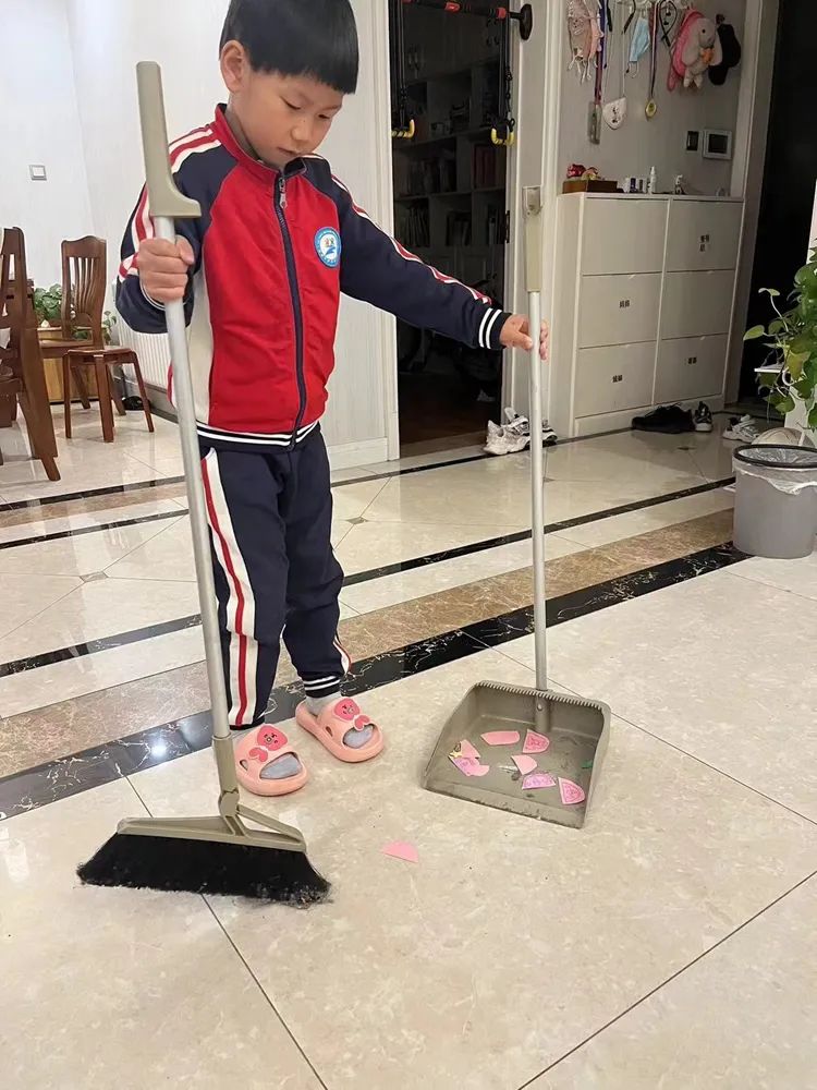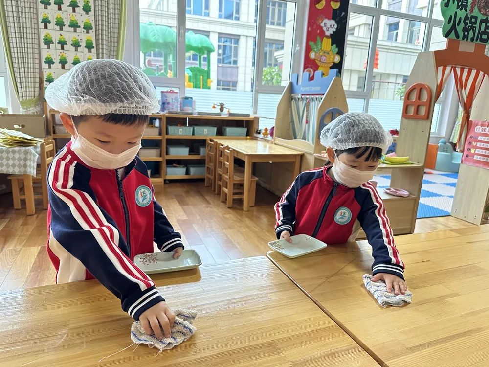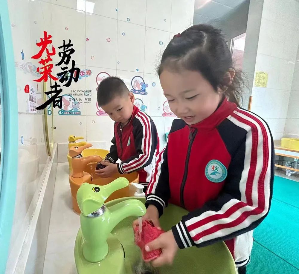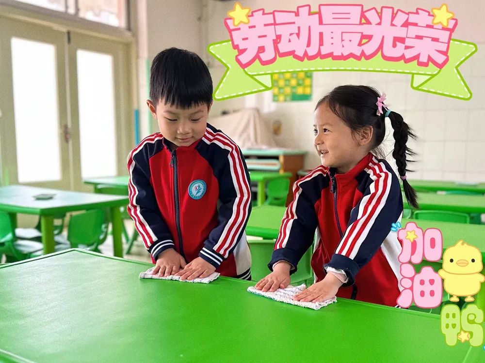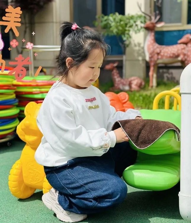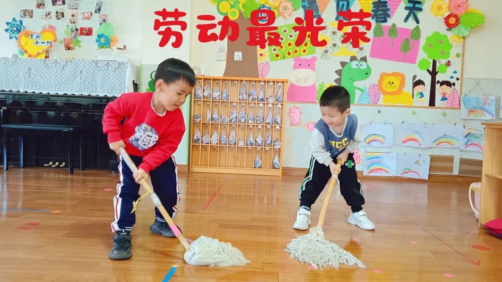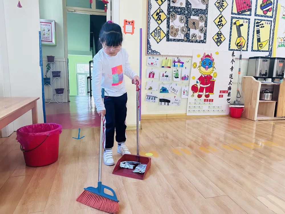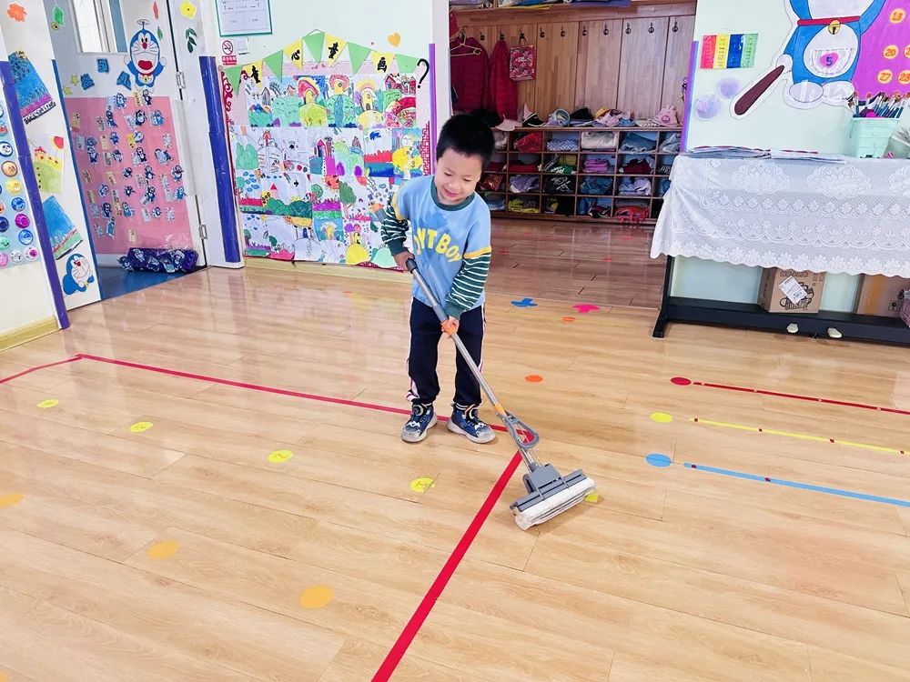 孩子们小小的身体有大大的能量,整理区域材料、擦桌子、扫地、擦椅子、玩具分类摆放、清洁地垫……通过孩子们的努力劳动,我们的班级和幼儿园焕然一新,孩子们也乐在其中。