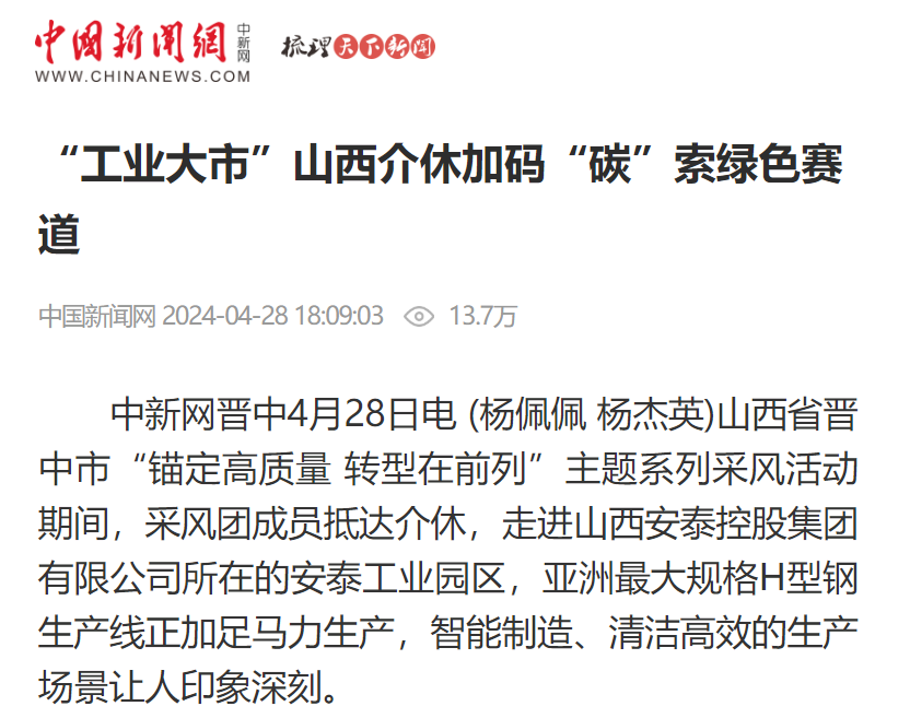 山西省晋中市“锚定高质量 转型在前列”主题系列采风活动期间,采风团成员抵达介休,走进山西安泰控股集团有限公司所在的安泰工业园区,亚洲最大规格H型钢生产线正加足马力生产,智能制造、清洁高效的生产场景让人印象深刻。