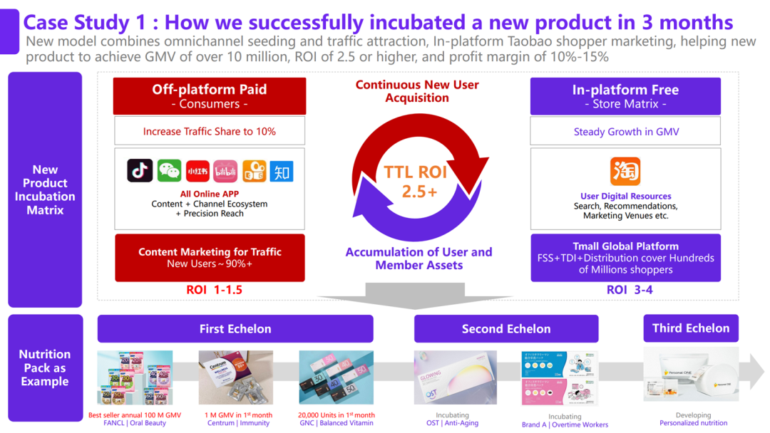 为了推动品牌可持续、有竞争力的增长,天猫国际打造了独特的“营销工具包”,带来一站式健康品牌营销解决方案。针对新品孵化创新推出品牌营销模式,结合全渠道运营、流量吸引、淘宝平台内购物营销,助力品牌3个月内即可在天猫国际完成新品孵化,投资回报率超2.5。