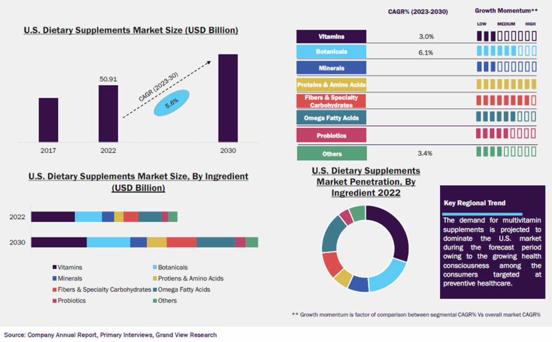 作为全球最大的营养保健食品市场之一,美国起步较早,已经形成相对成熟和稳定的体系,涌现出一批如 GNC、Nature's Bounty、NatureMade等具有悠久历史和重要影响力的国际品牌。在美国,营养健康产品的法定名称是“膳食补充剂”。Grand View Research数据显示,2022年美国膳食补充剂市场规模约为509.1亿美元,预计到2030年将达到789.4亿美元,从2023-2030年的复合年增长率(CAGR)为5.7%,处于强劲增长的路径上。