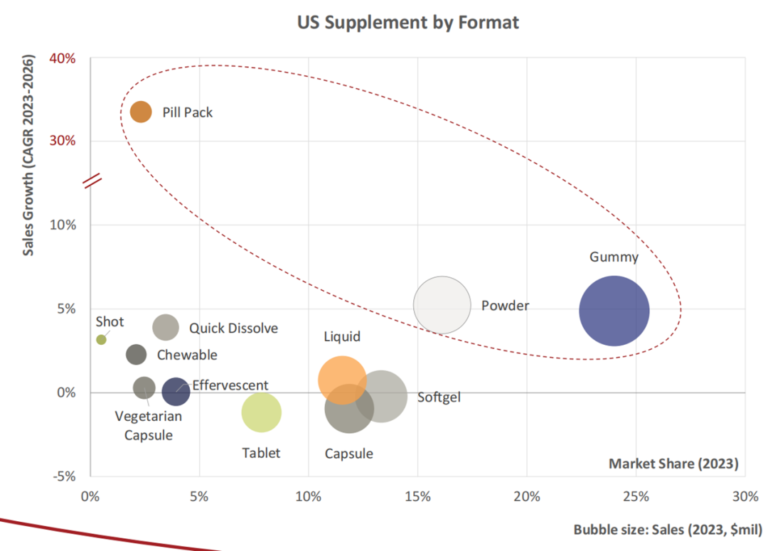 在剂型方面,除了胶囊、片剂、粉末等较为传统的剂型外,软糖以便携、好吃的优势占据了美国膳食补充剂市场的主要份额;具有“个性化+便利”的营养包也正在成为新的增长点,受到消费者热捧。
