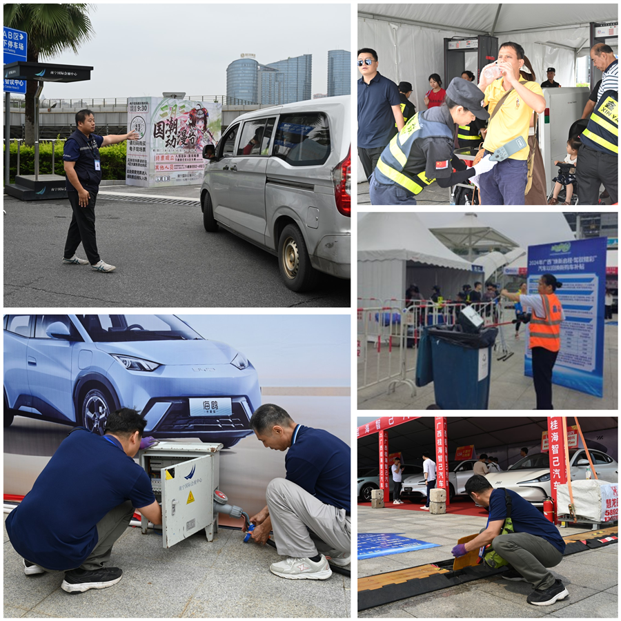 安保人员严格把控各个出入口,疏导车辆,细致入微地做好安检工作,确保会场安全有序。
