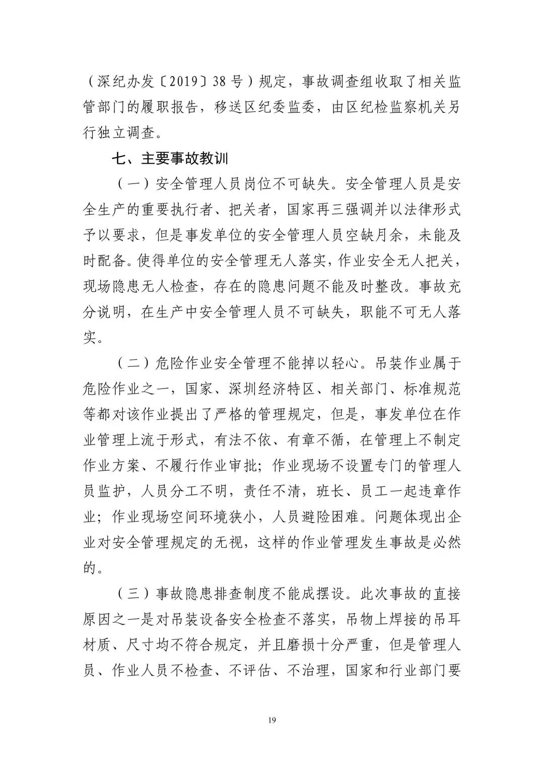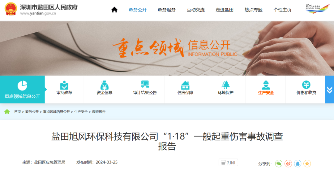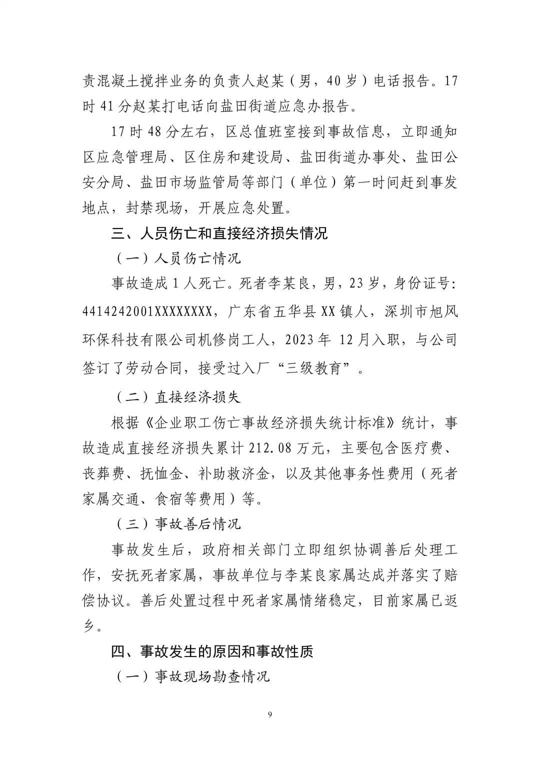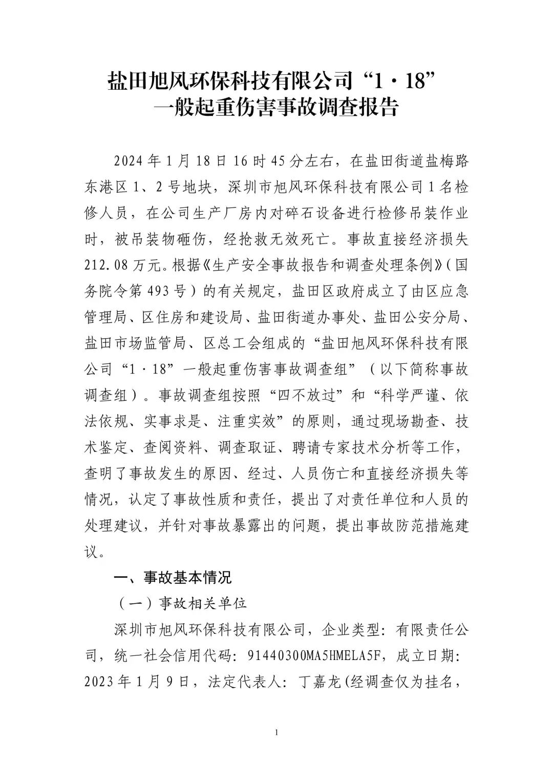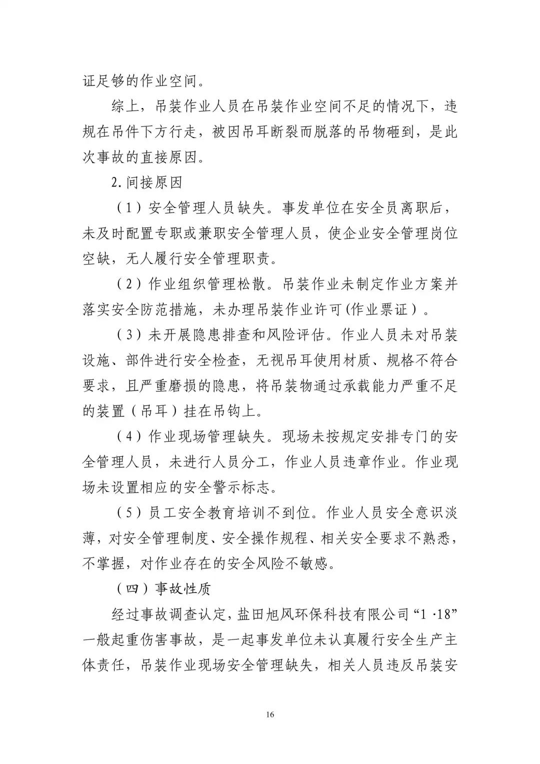经过事故调查认定,盐田旭风环保科技有限公司“1·18”一般起重伤害事故,是一起事发单位未认真履行安全生产主体责任,吊装作业现场安全管理缺失,相关人员违反吊装安全管理规定,设备吊装构建存在问题,安全隐患排查不到位而导致的一般生产安全责任事故。