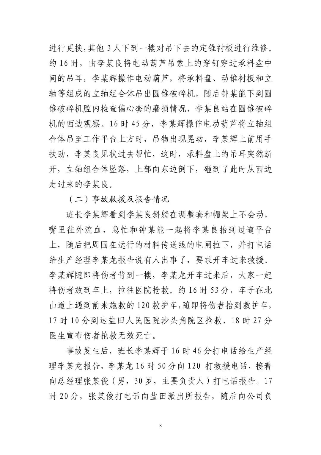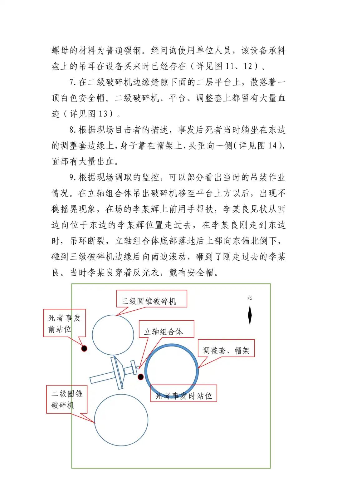 18日7时左右,生产经理李某龙(男,35岁)召集李某辉(男,40岁,机修班长)、钟某能(男,38岁,检修工)和李某良(男,23岁,检修工,死者)等6名检修人员召开班前会,会后由班长李某辉带领检修人员,来到待修的二级圆锥破碎机所在的生产车间3层平台做准备工作。