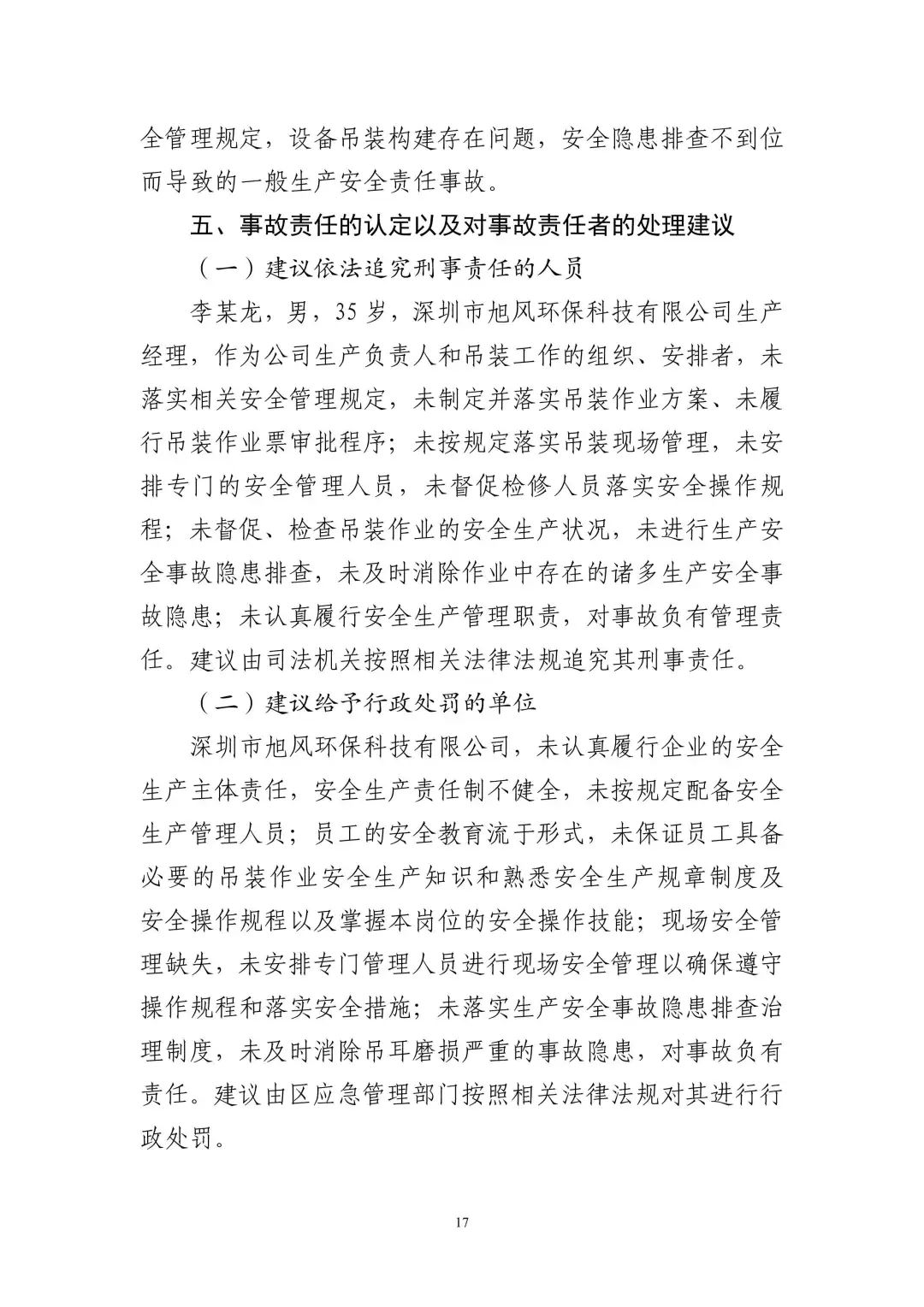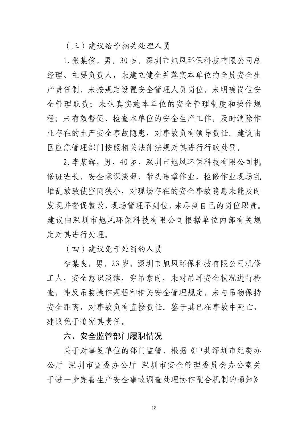 李某龙,男,35岁,深圳市旭风环保科技有限公司生产经理,作为公司生产负责人和吊装工作的组织、安排者,未落实相关安全管理规定,未制定并落实吊装作业方案、未履行吊装作业票审批程序;未按规定落实吊装现场管理,未安排专门的安全管理人员,未督促检修人员落实安全操作规程;未督促、检查吊装作业的安全生产状况,未进行生产安全事故隐患排查,未及时消除作业中存在的诸多生产安全事故隐患;未认真履行安全生产管理职责,对事故负有管理责任。建议由司法机关按照相关法律法规追究其刑事责任。