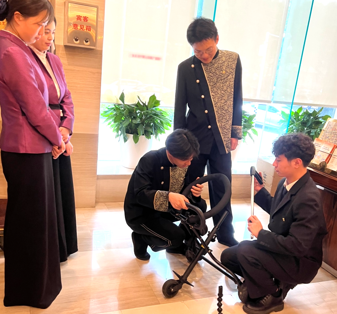 前厅部组织行李员、咨客,学习儿童车使用操作,提升实操能力。