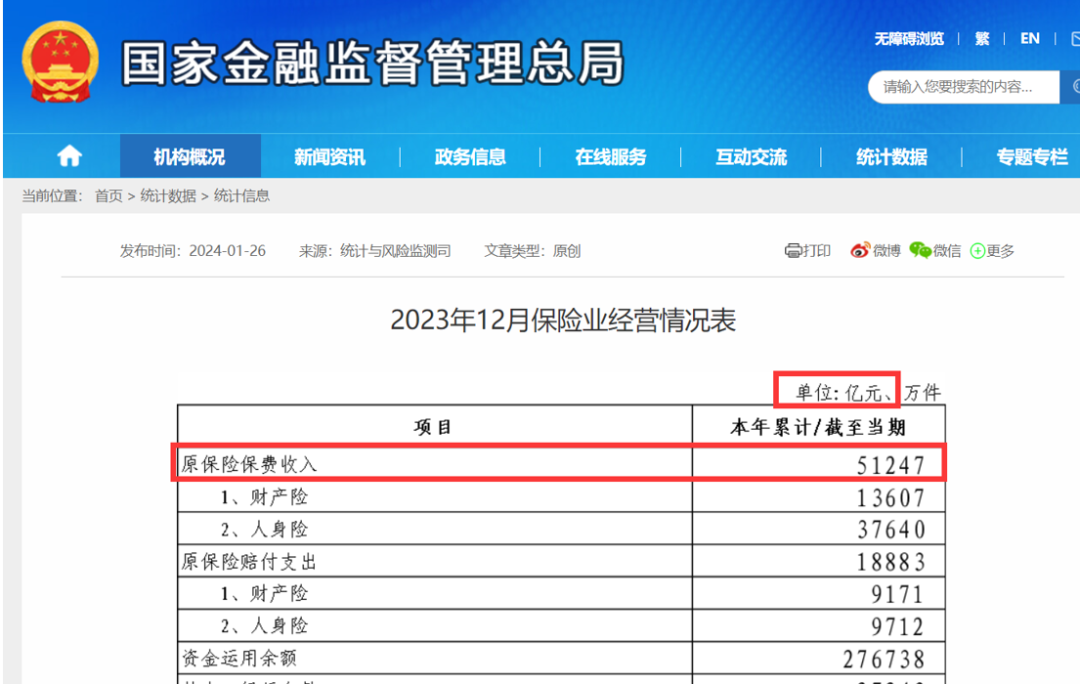 2023年1-12月保险业经营情况原保险保费收入51247亿元。