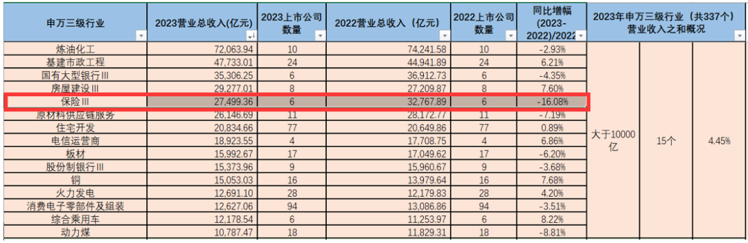 2023年度337个申万三级行业营业收入大于一万亿的有15个行业。其中保险行业6家上市公司总共营收2.7万亿元。