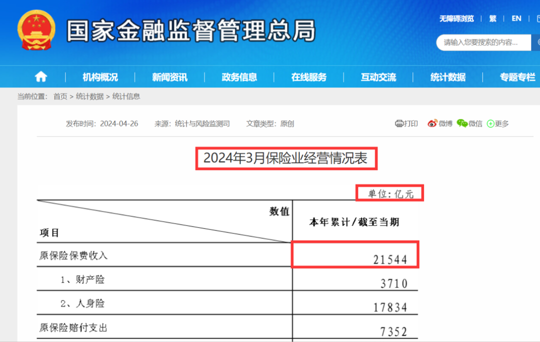 2024年1-3月保险业经营情况原保险保费收入21544亿元。