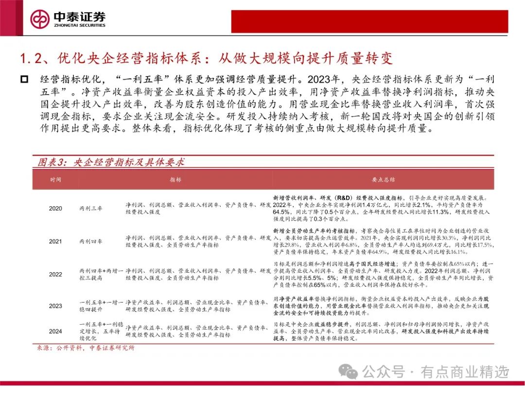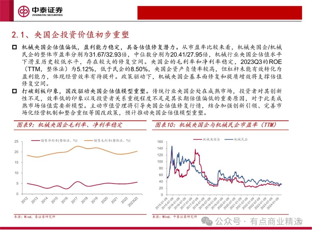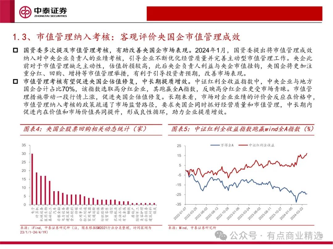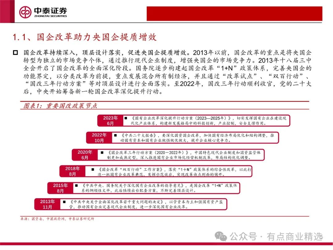 国企改革助推央国企估值重塑。十八届三中全会以来,国企改革深入实施,国有企业提质增效成果显著。2023年起,国资委开展新一轮国企改革深化提升行动,2024年发布新“国九条”,