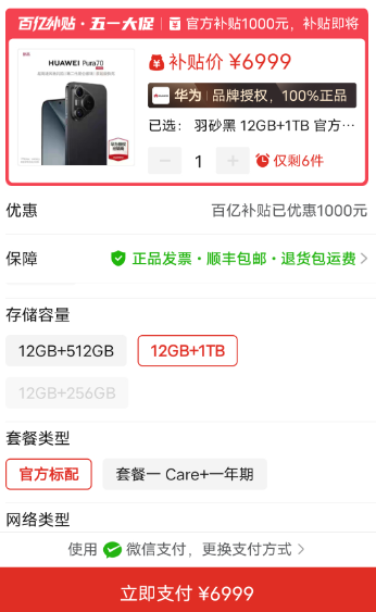目前华为官方Pura 70系列所有颜色、所有存储版本都处在限时抢购阶段,Pura 70 Pro甚至还显示【暂不售卖】,证明虽然备货预期要好的多,货源供应改善速度也会更快,但目前依然处在供应较为紧张的阶段,可第三方却能放出部分版本现货,而且价格设置还相当有意思,官方原价在PDD中第三方店铺却显示是补贴1000元之后的价格,也就是说之前涨价了这么多。