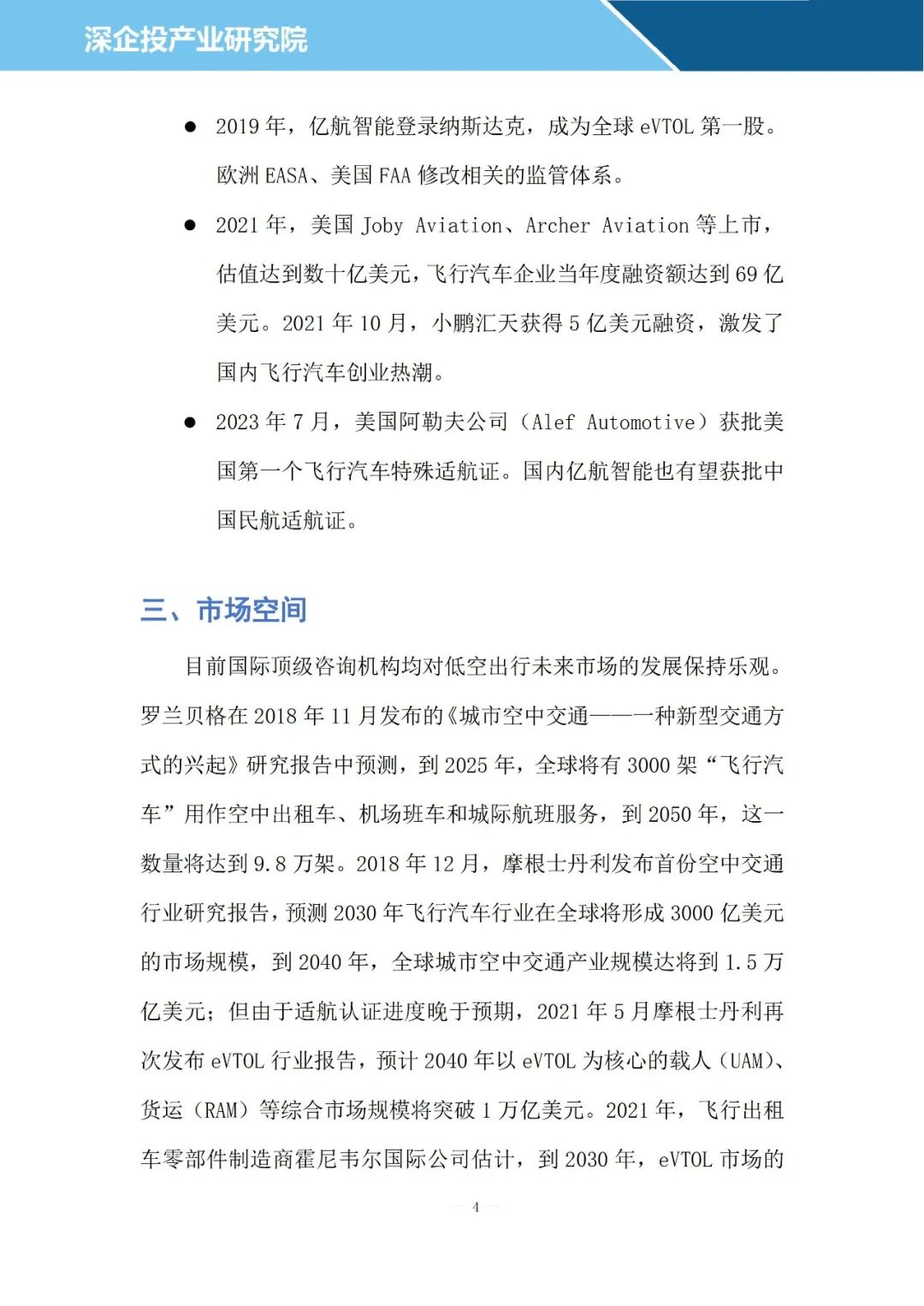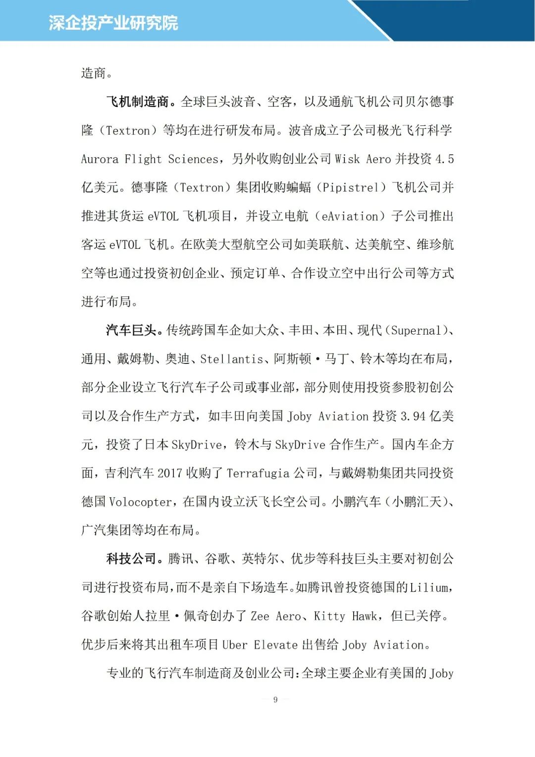 飞行汽车是燃油航空的电动化革命,是破解大城市交通拥堵的多元化选择之一,能够与地面交通工具相互补充,未来可能有万亿美元的市场空间。波音、空客等飞机制造商,大众、丰田、吉利、小鹏等汽车厂商,以及腾讯、谷歌等科技巨头均在布局。