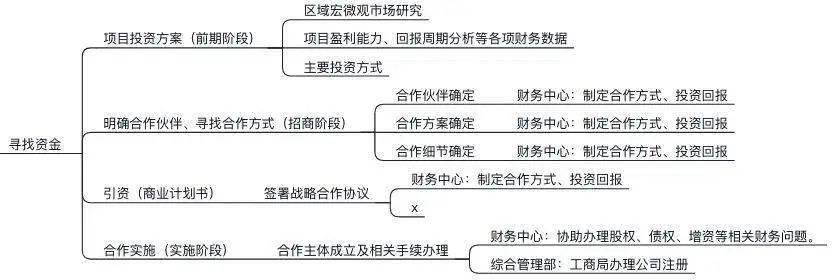2、寻找合作伙伴、明确合作方式。项目财务部需要深度参与此步骤,完成对合作伙伴的确定,合作方案的确定,合作细节的确定;