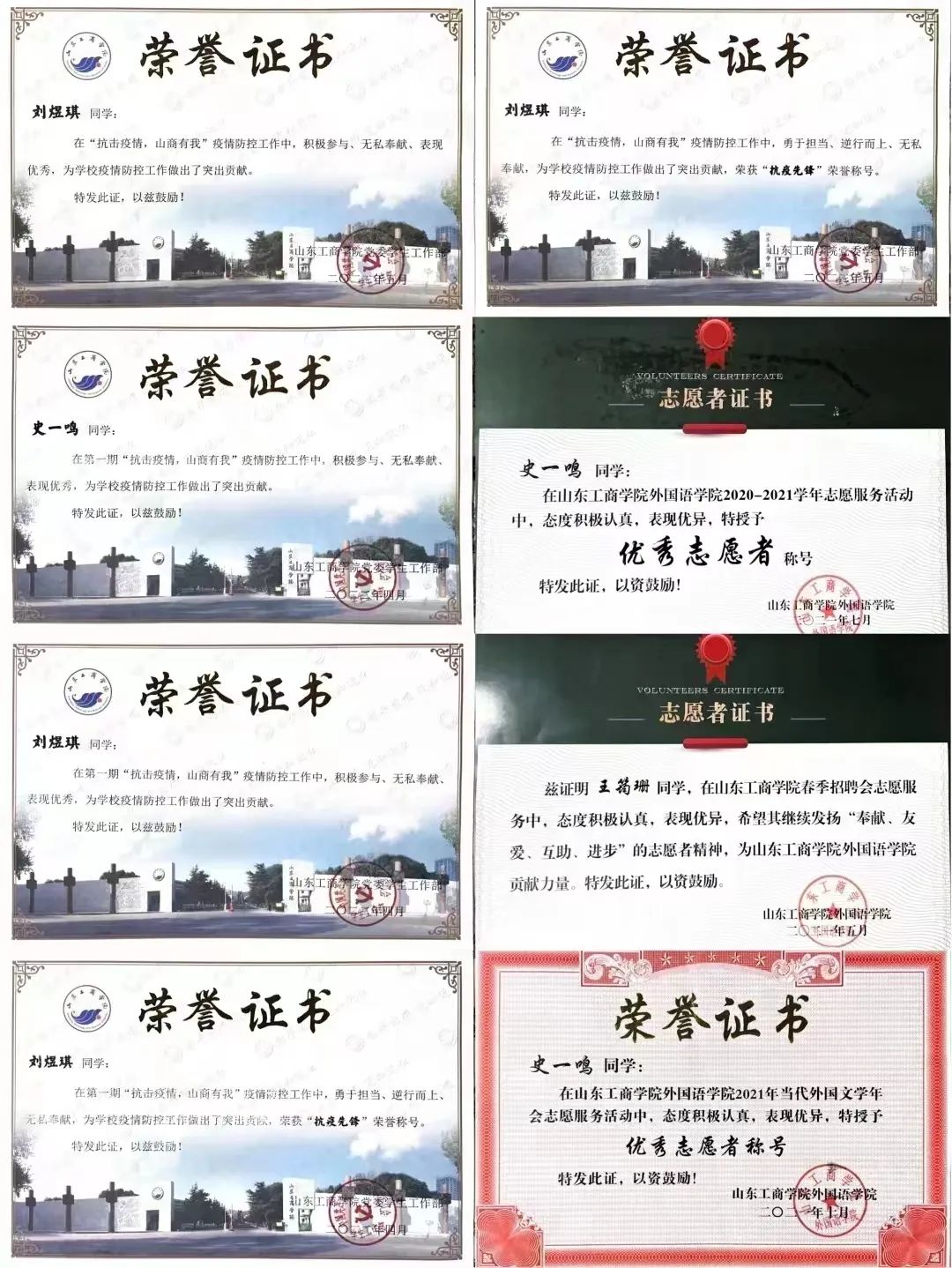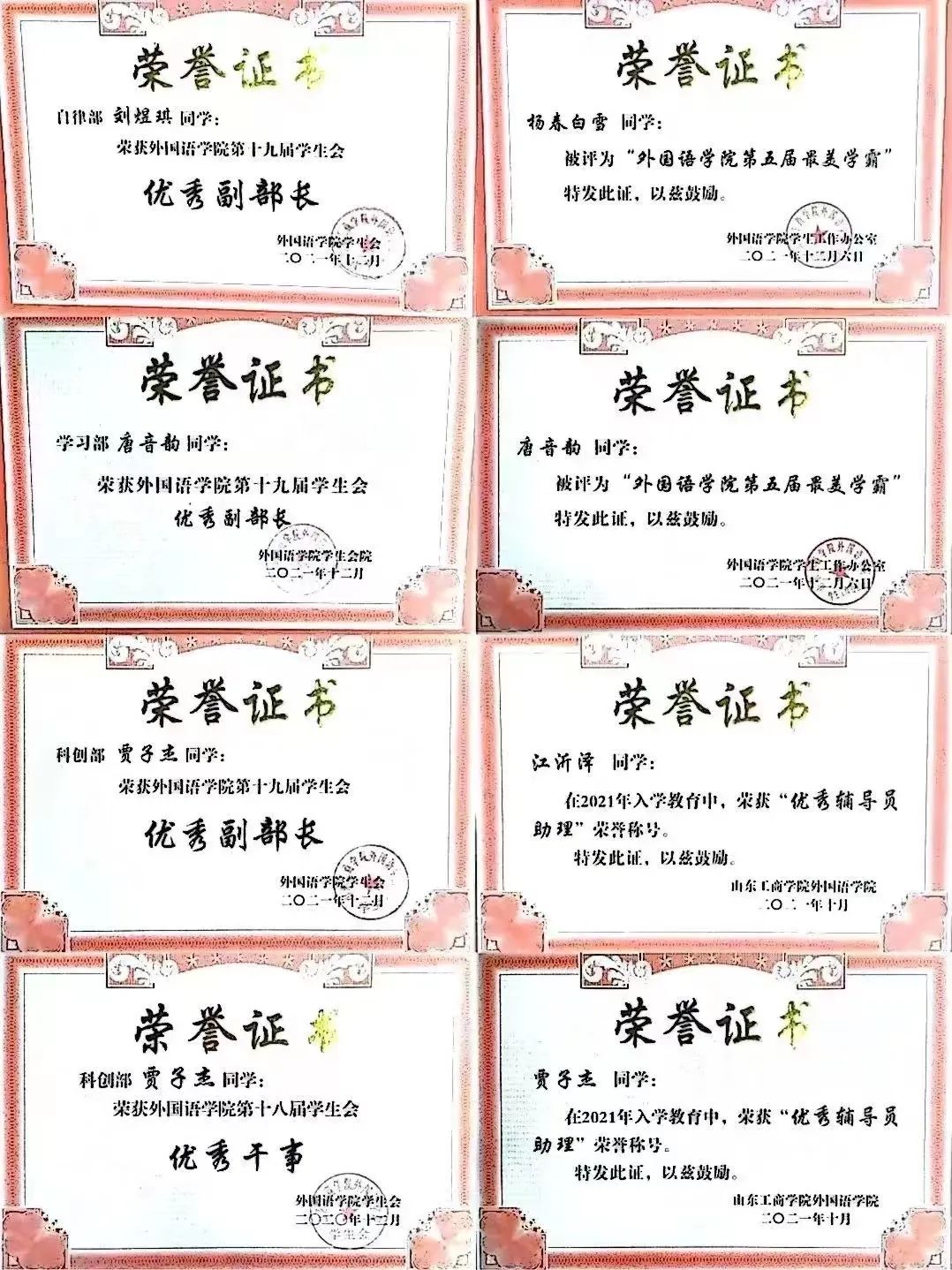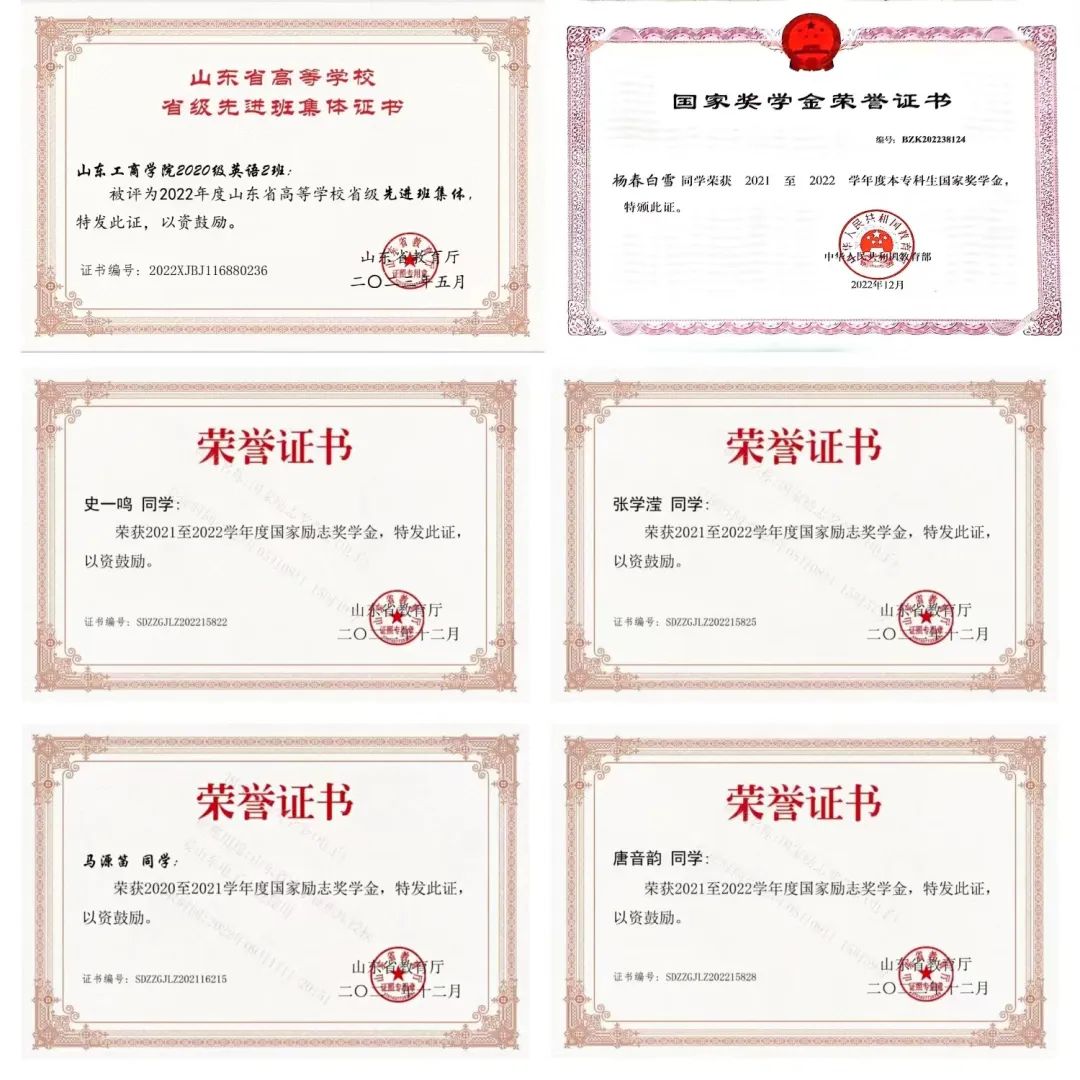 英外202班共20余名同学在各个校级、院级学生组织中担任重要学生干部,其中,我班刘煜琪同学为山东工商学院2018级退伍军人入学新生,曾被评为2021年度山东省高等教育学校“优秀学生”,曾被聘任为烟台开发区高级中学校外国防指导老师,曾任院级学生会主席团成员。除此以外,英外202班团支部中十余名同学曾任校级、院级学生会执行主席、部门负责人等,十余名同学曾在学生组织中获得“优秀辅导员助理”等多种荣誉称号;团支部同学同时积极参与各项文体赛事,获得多项校级奖项;多名同学积极投入到各类志愿活动中,曾在多项志愿服务中获得“优秀志愿者”称号。