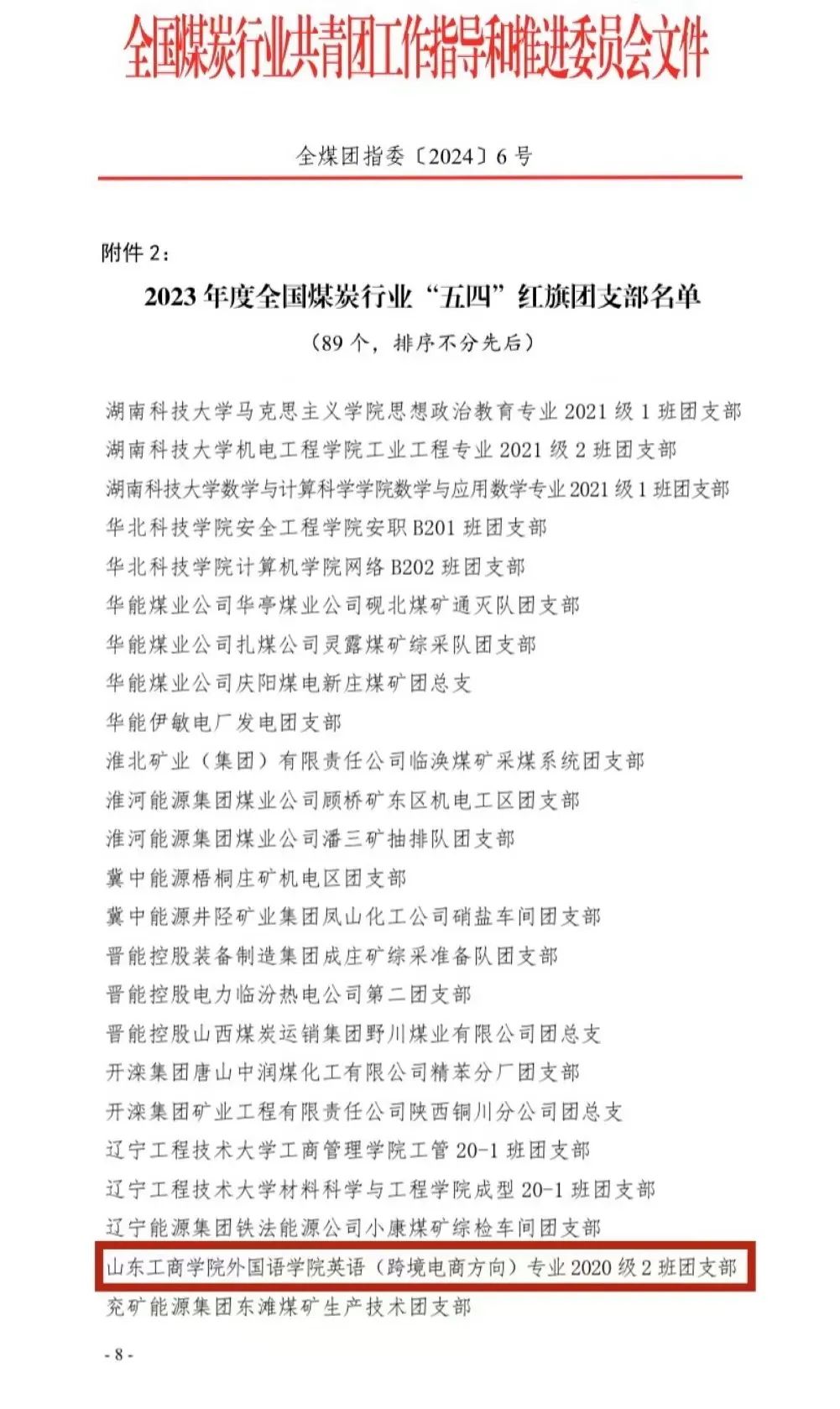 近日,全国煤炭行业共青团工作指导和推进委员会发布《关于表彰2023年度全国煤炭行业“五四”红旗团委(团支部)、优秀共青团员和优秀共青团干部的决定》,山东工商学院外国语学院2020级英语(跨境电商方向)专业2班团支部获评2023年度全国煤炭行业“五四”红旗团支部。