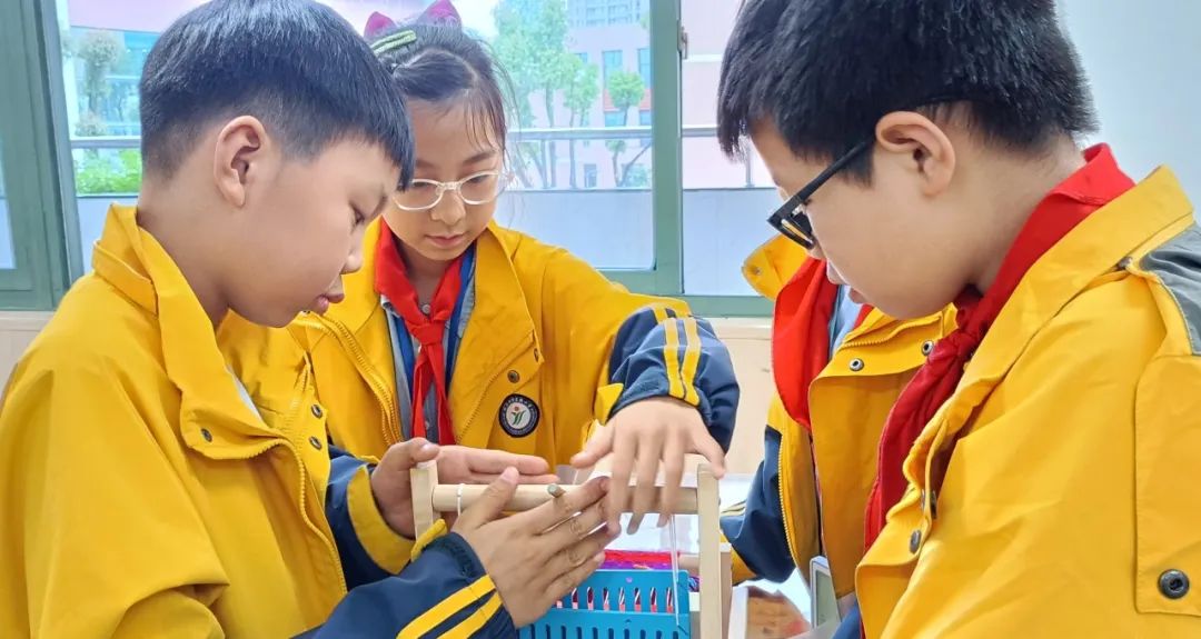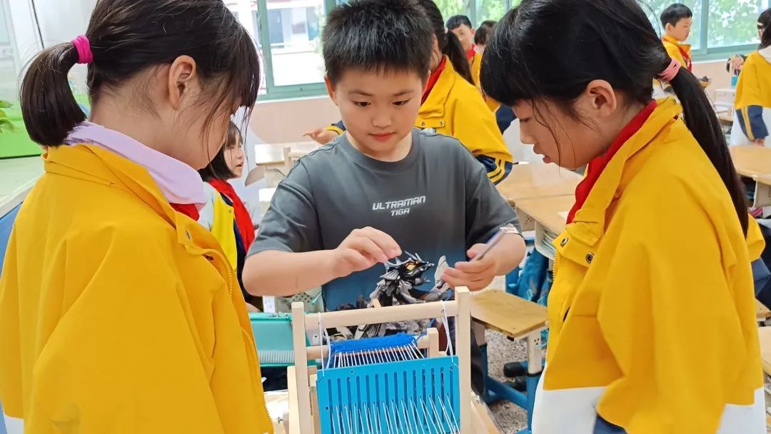 学生们在面料馆老师的指导下,选择自己喜欢的毛线颜色,把选好的毛线穿进小织机上来回穿梭,慢慢织出一块属于自己的布。通过织布机模型的操作认知经和纬,更形象地了解一块布的形成。