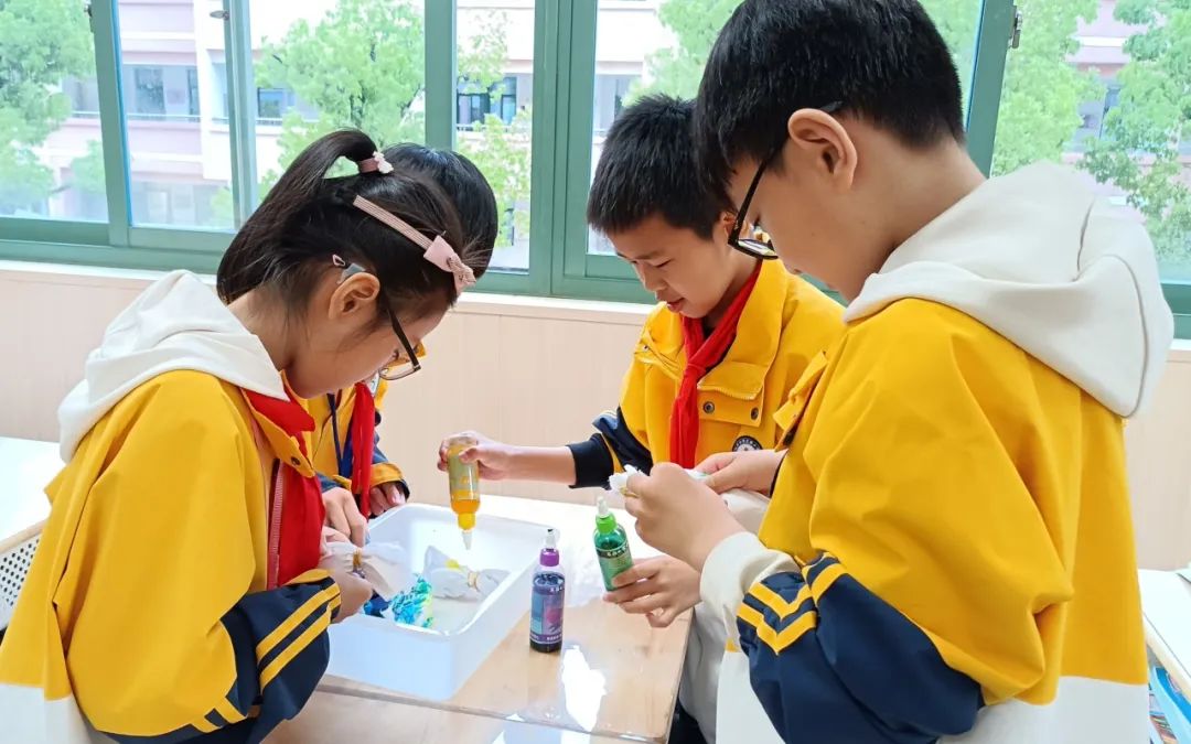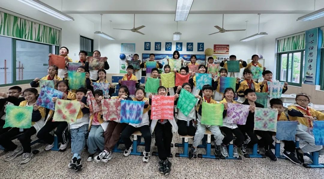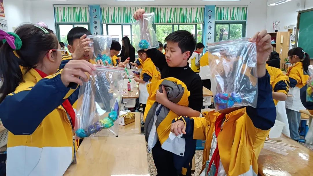 织布结束后,面料馆老师通过PPT和视频向学生们介绍了扎染的来历和发展过程,让大家对扎染有了初步了解,再向大家讲解手工扎染的操作步骤。学生用线、绳等对方巾进行紧固的结、系、捆、绑、夹等多种形式组合的染色方式进行实操,大家发挥自己的想象力和创造力,一块块未知图案的呈现让学生们充满期待,感受到扎染的乐趣。