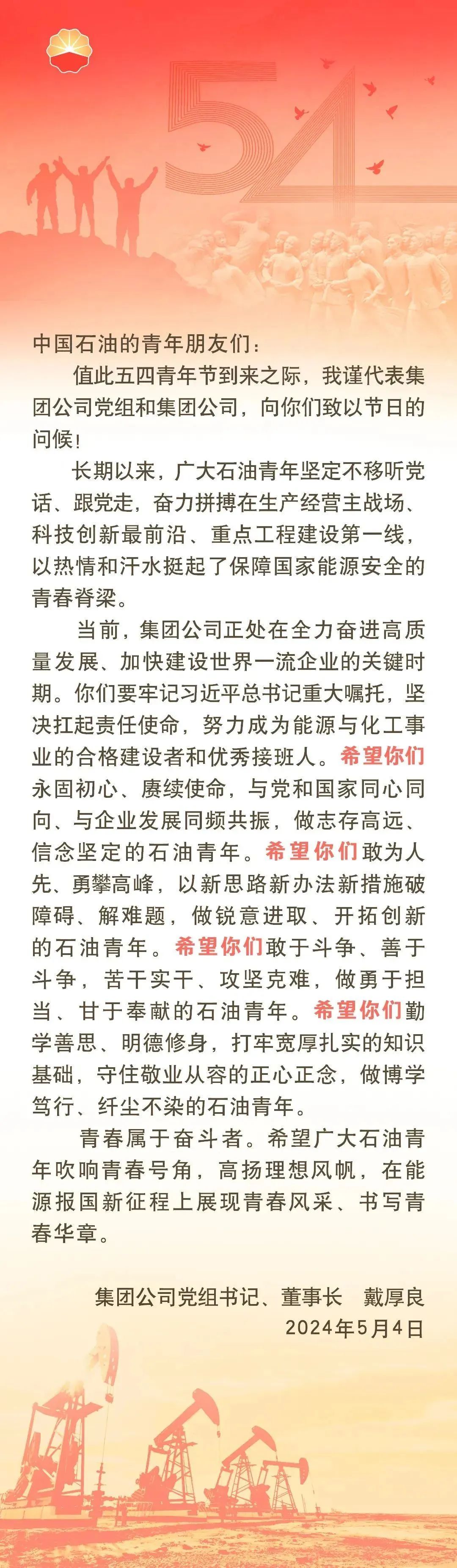 集团公司党组书记、董事长戴厚良寄语石油青年,在能源报国新征程上展现青春风采、书写青春华章