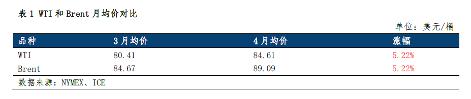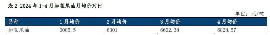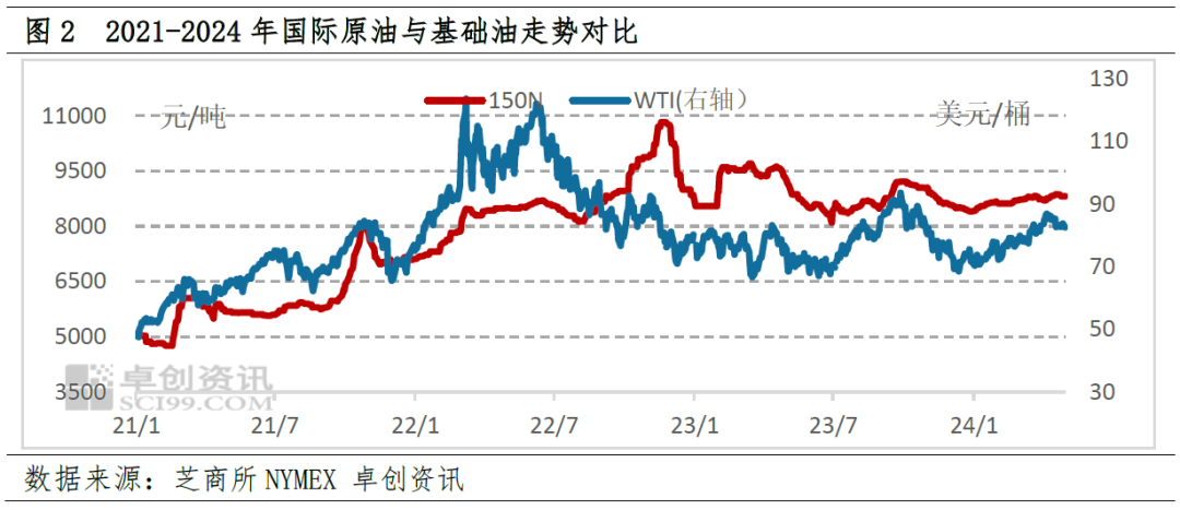 基础油属于近油端产品,其价格受国际原油影响较大。2024年4月,美原油均价84.61美元/桶,较上月涨5.22%,同比去年涨6.51%;布伦特原油均价89.09美元/桶,较上月涨5.22%,同比去年涨6.86%(表1),一定程度支撑国内基础油生产成本。