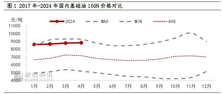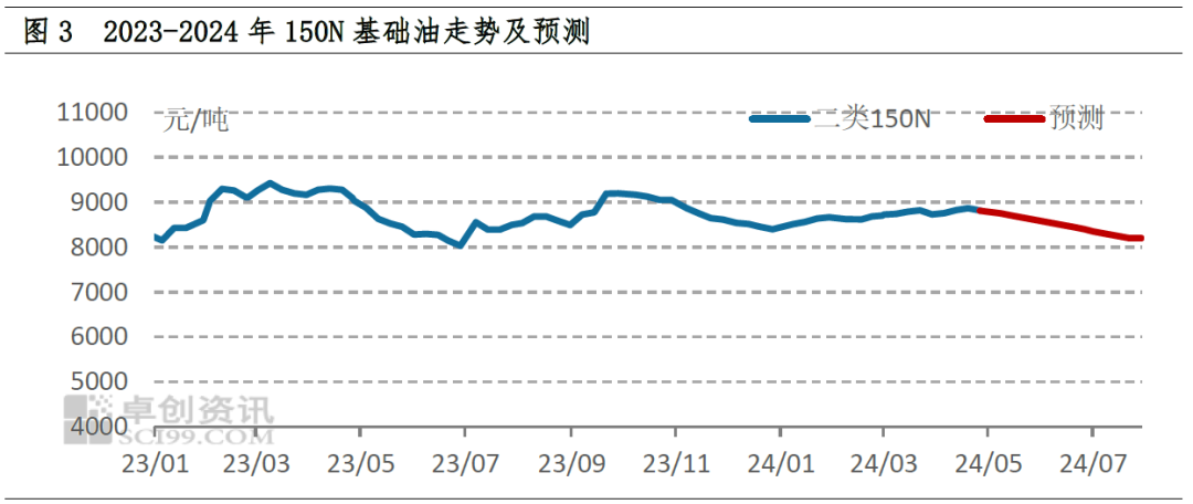 综合来看,从基本面来看,预计未来三个月,基础油市场供应小幅回落,需求缩减明显,但市场整体保持供大于求状态,炼厂库存升温。受季节性需求变化,预计基础油市场需求逐步缩减,对市场施加下行压力。预计2024年5月-7月,国内150N均价分别为8675元/吨、8475元/吨、8260元/吨。